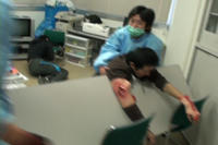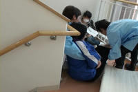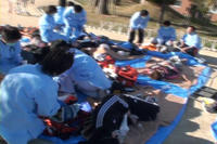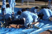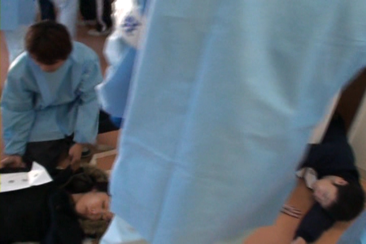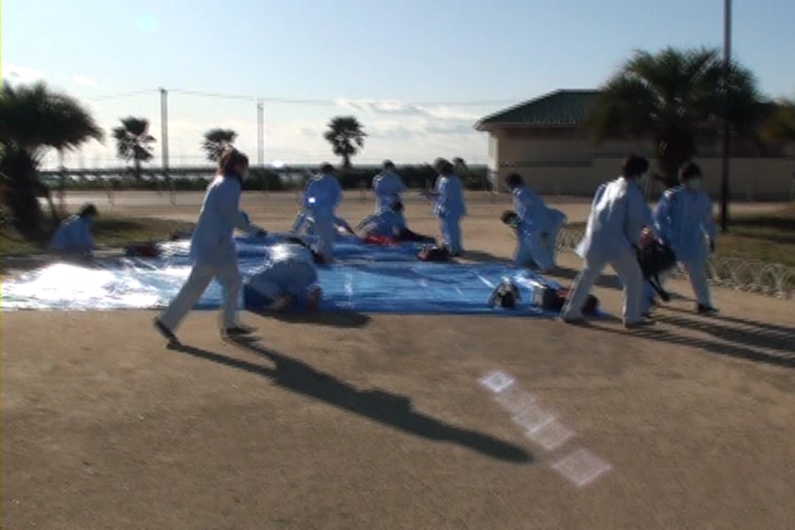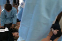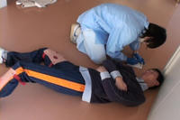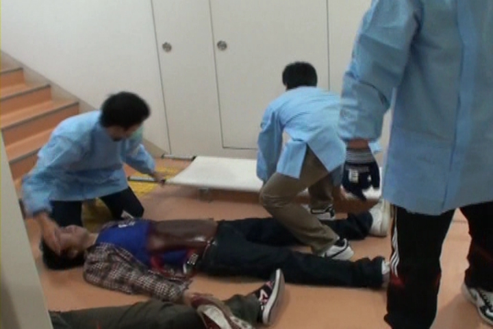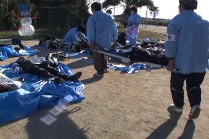 という想定の元、廊下や階段、室内など広範囲に広がった様々な傷病者を搬送・トリアージし、屋外に設置された救護所で観察や処置、再トリアージなどが行われ、重傷者(赤の中でも最優先者)を救急車に収容し病院へ搬送するというのが一連の流れでした。