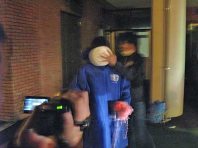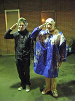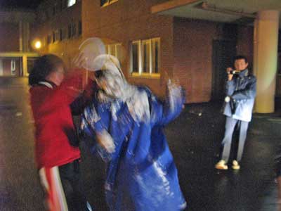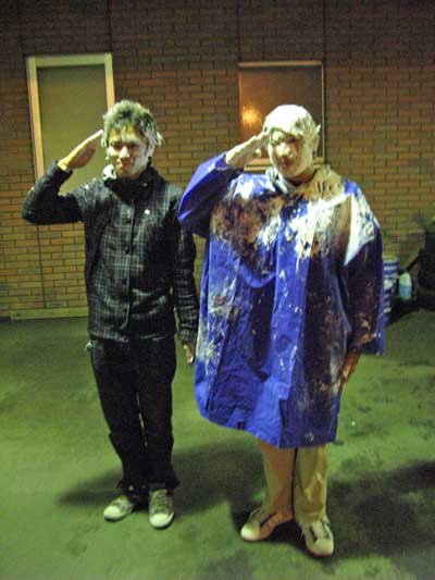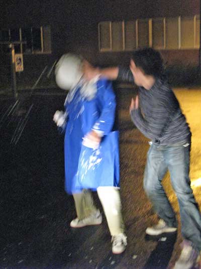 みんなからクラッカーでお祝いされ、ムードも高まってきた頃・・・院生先輩のおめでとう!を合図にお祝い第2段が開始しました。次々と繰り広げられるパイの波状攻撃!一名巻き添えを食らいました。すさまじいテンションの高さで誕生会が終了しました。最後はみんなでかたづけ。