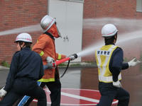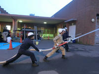 ↑放水体験にて隊員が筒先の持ち方を指導している様子。