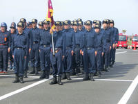 新入生達が 放水体験や消火器の使用体験を行い、隊員の先輩たちの規律訓練の様子の見学もしました。