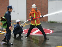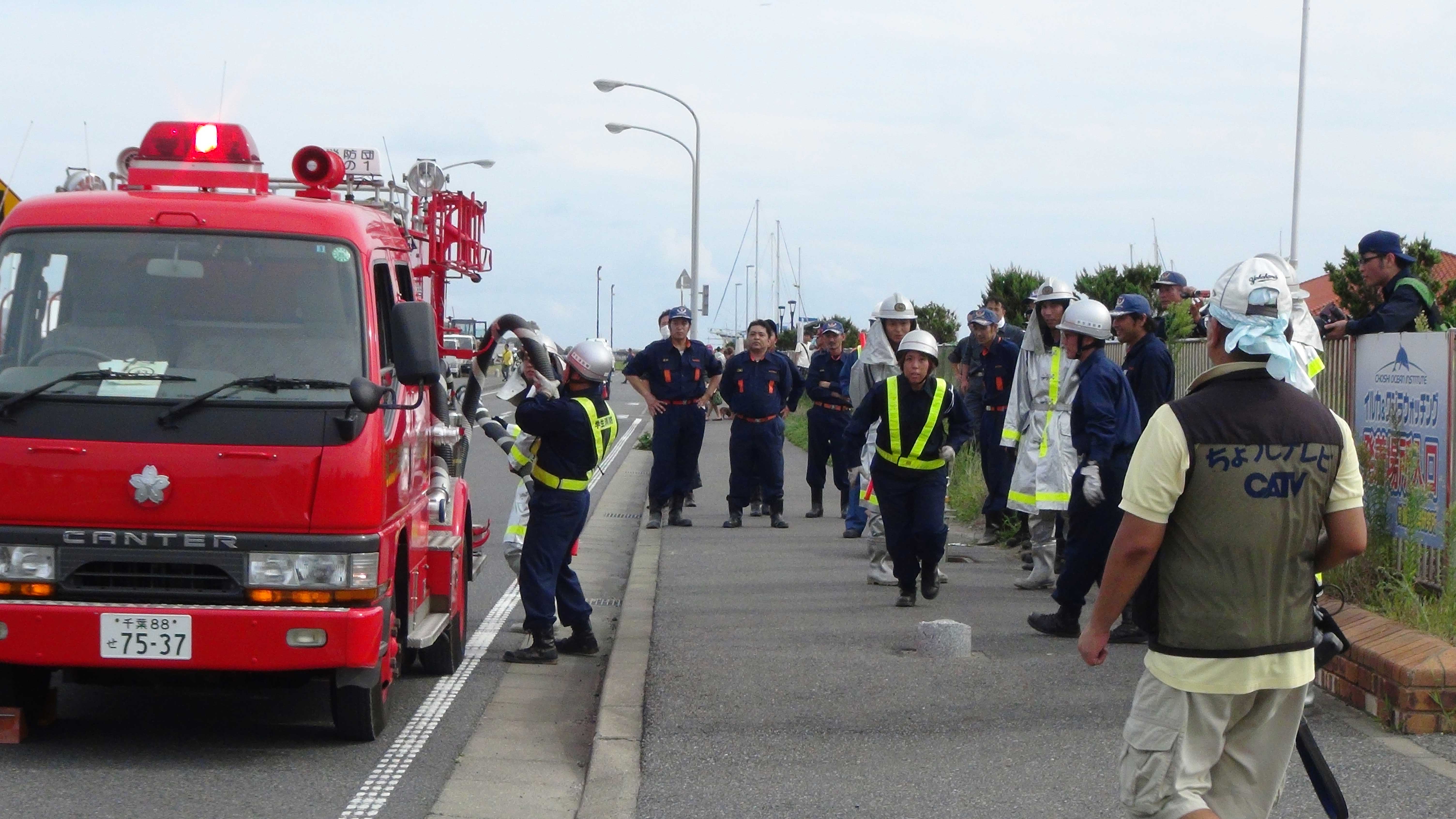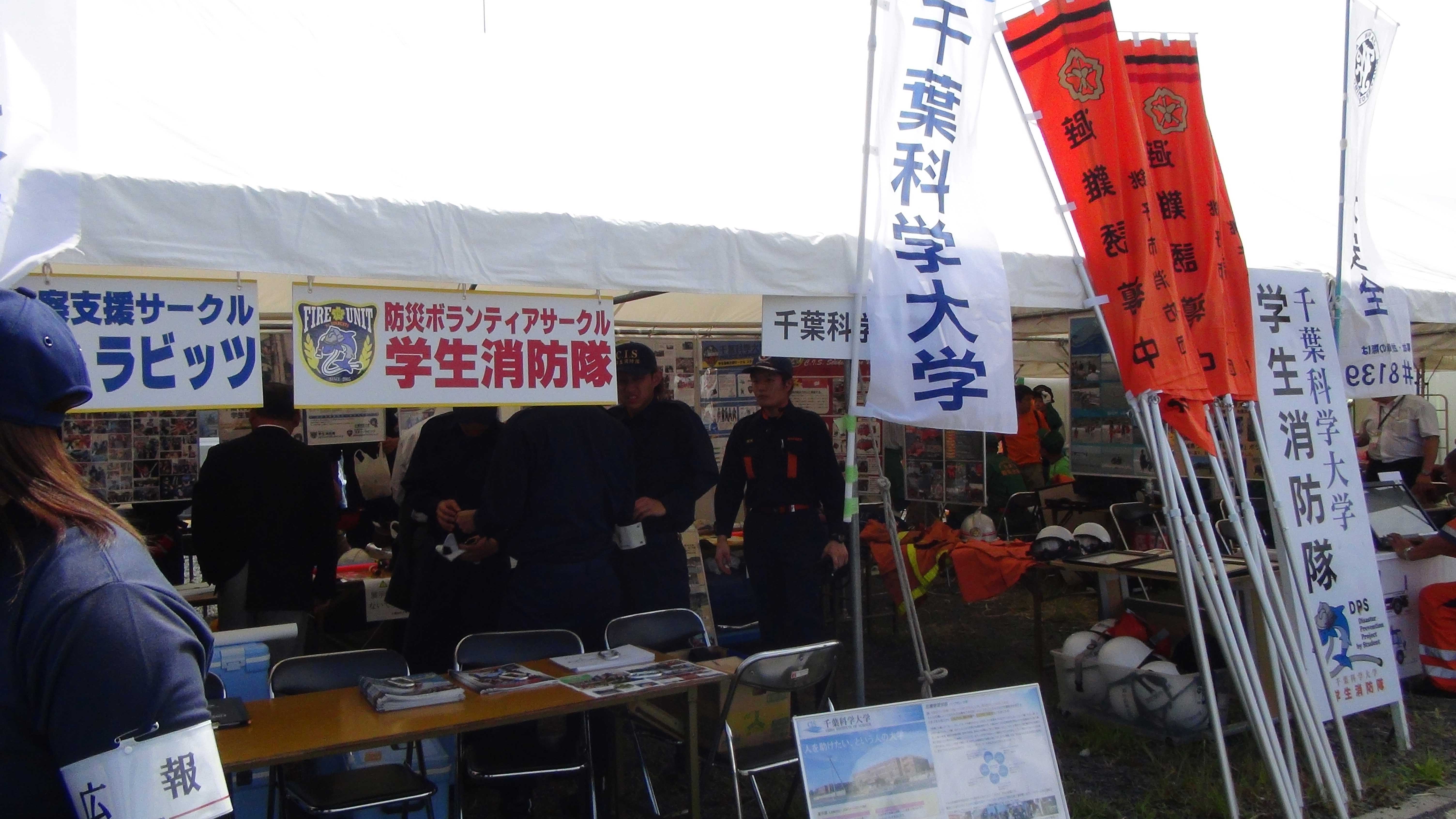 今日は千葉科学大学前で九都県市合同防災訓練が開催されました。 ↑市民の避難誘導状況 私たちは訓練ではヘリポートの散水・自助の訓練・火災防御訓練の3パートを担当させていただきました。 まず、ヘリポートへの散水は私たちの消防車を使って散水を行いました。 着陸にちょうど良い湿り具合にするのに、泥だらけになりながら頑張っていました! そして、自助の訓練では学生消防隊のみでメインステージに登場し、災害時に必要な技術を披露しました。 ↑最終ミーティング ↑レスキューハンマーシーン 来賓や関係者の方々には参考になったと思われますが、私たちとしてもかなり勉強になりました。 初めて学ぶことばかりで、とても新鮮味があり楽しかったです。 最後に火災防御訓練を実施しました。 実際に火災が起きた想定で、私たちと銚子市団、銚子消防本部の連携で消火まで訓練を行いました。 パートの中でできることを団と決め、スムーズに連携がとれるように尽力しました。 ↑吸管から展開状況 おかげで、実際に発生した場合でも効率よく対応できるように努めます。 また、展示ブースでは学生消防隊と学生警察支援サークルスターラビッツのブースを設けていただき、たくさんの方々に学生消防隊を知っていただくことができてうれしかったです。 ↑当日の展示ブース状況 来て下さった方々、本当にありがとうございました! そして、不快な思いをされた皆様申し訳ありませんでした。 来て下さったより多くのお客様にきちんとわかりやく展示できるように、さらなる創意工夫を凝らしていきます。 今年度も九都県市合同防災訓練に参加させていただきありがとうございました! とても良い経験になりました。 おかげで、成長することが出来た気がします。 これからも学生消防隊をよろしくお願いいたします。