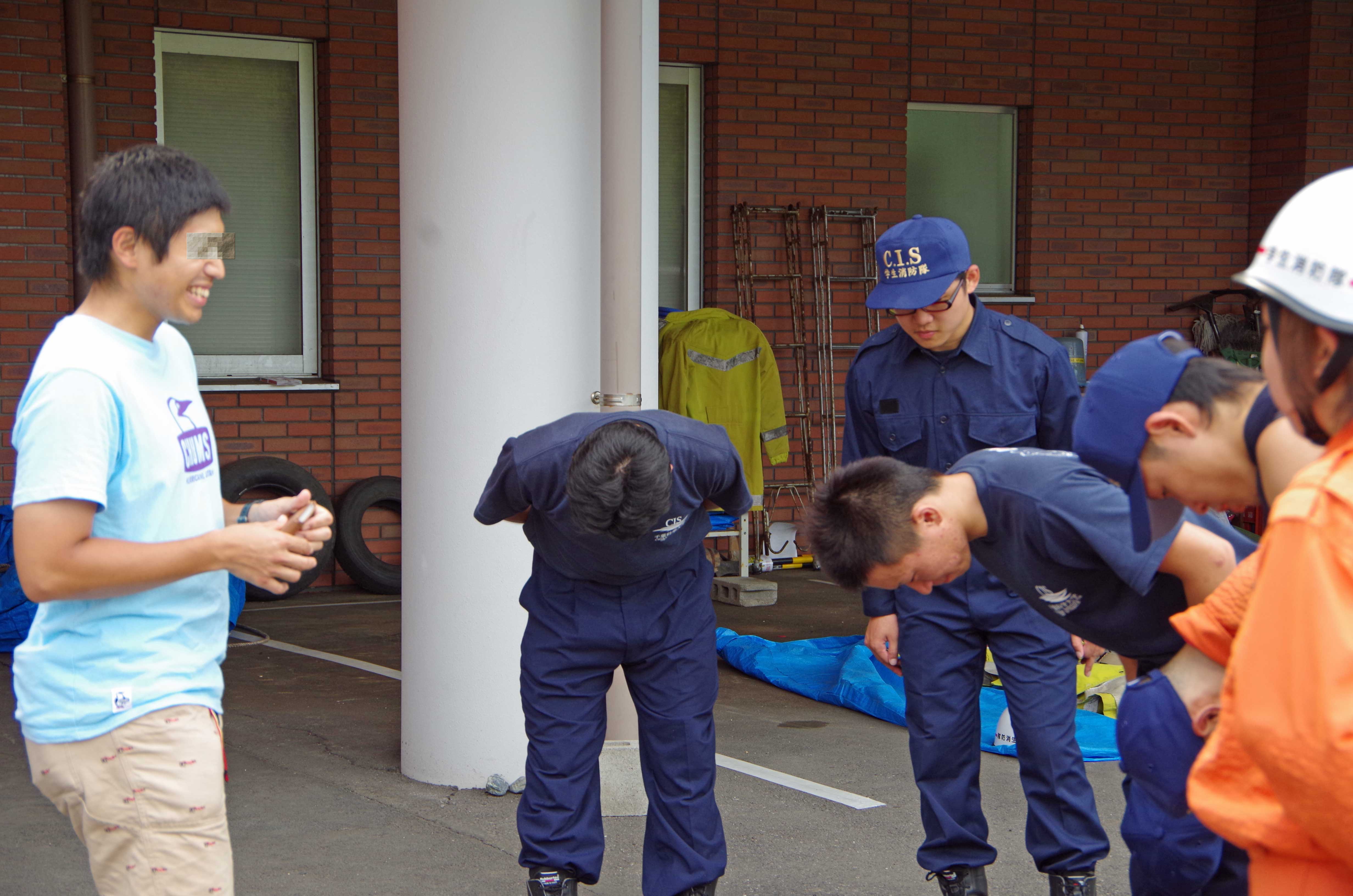 昨日はオープンキャンパスでの模擬訓練と警備訓練を実施しました。 ↑シナリオ打ち合わせ オープンキャンパスでは常備消防隊と救助隊、学生消防隊に分かれ各々のパートごとに訓練を行いました。 ↑ホース収集訓練 ↑呼吸器の装着訓練 新入隊員は初の訓練内容に興奮を隠しきれてない様子でした。(笑) また、酸素ボンベを背負ったときの表情はとてもいい顔していました。 その後、20日の浅間神社祭りに向け警備訓練を行いました。 初の警備活動を行う上で、必要な知識を実践形式で訓練をしました。 ↑警備訓練の活動状況 慣れない警備方法に困惑している隊員もいましたが、副隊長の指導力が高いおかげか真剣に取り組み、納得できるよう質問をし身につけられるよう努力していました。 入隊してから約3か月経つ新入隊員は、返事をしっかりするようになり、メリハリを徐々につけ、規律も覚え始めもうすぐでスタートラインに立てそうな気がしてきました。 成長し続ける彼らを温かく見守ってください。 ~オフショット~ 昨日の訓練では久しぶりに先輩方がいらっしゃり、戯れました。(笑) ↑下剋上なうww なぜか先輩がいると不意に甘えてしまう3年生の姿がそこにありました。