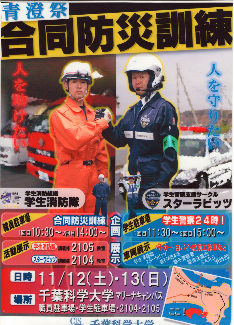 第8回 青澄祭が2011年11月12日(土)、13日(日)に千葉科学大学マリーナキャンパスにて開催予定です!今年も、学生消防隊はスターラビッツ、各関係機関のご協力の下、合同防災訓練を実施致します。(スターラビッツ製作)☆千葉科学大学 第8回青澄祭における合同防災訓練☆開催日時:2011年11月12日(土)、13日(日) ●午前の部 10時30分~ ●午後の部 14時00分~※炊き出し訓練は両日とも12時より配布予定。数量限定。 場所:千葉科学大学 マリーナキャンパス C駐車場周辺参加団体(50音順): ●災害救助犬チームS.A.R.D (災害救助犬2頭) *12日のみ ●銚子警察署 (パトカー、白バイ) ●銚子市消防団 (多機能型消防車) ●銚子市消防本部 (救助工作車) *12日のみ ●銚子市赤十字奉仕団 ●千葉科学大学 ●千葉科学大学 学生消防隊 ●千葉科学大学 スターラビッツ ●陸上自衛隊第一空挺団後方支援隊 (野外炊具車両)実施方針:訓練と展示内容①訓練は「発災対応型訓練」、「避難所開設訓練」、「炊き出し訓練」の3部構成とする。今後発生しうる首都直下型地震とそれに伴う東方沖地震を想定する事で、来場者に災害が発生した時にどうするか、を考える場として頂く実戦的な訓練を行う。○首都直下型地震が発生し、余震が千葉県東方沖で発生○学生消防隊・スターラビッツによる合同式本部の設置・運営訓練○大津波警報が発令、学生消防隊・スターラビッツによる避難誘導訓練○銚子市消防団と連携した、学生消防隊による避難所開設訓練○(常備消防役)学生消防隊員による消火訓練○銚子警察署と連携した、スターラビッツによる市内広報・警戒活動訓練○災害救助犬チームS.A.R.D.と連携した、人命検索訓練○(常備消防レスキュー隊役)学生消防隊員による救出救助訓練○(常備消防救急隊役)学生消防隊員によるトリアージ・搬送訓練○陸上自衛隊、赤十字奉仕団と連携した、炊き出し訓練②銚子市消防本部の救助工作車、銚子市消防団の多機能型消防車、銚子警察署のパトカー・白バイ、陸上自衛隊の野外炊具等を展示するとともに、参加者の災害時における公的機関の役割について理解を深める。当日は天候により青澄祭が中止となることがあります。その際にはツイッター等でお知らせさせていただきます。当日のご来場をお待ちしております(・v・)