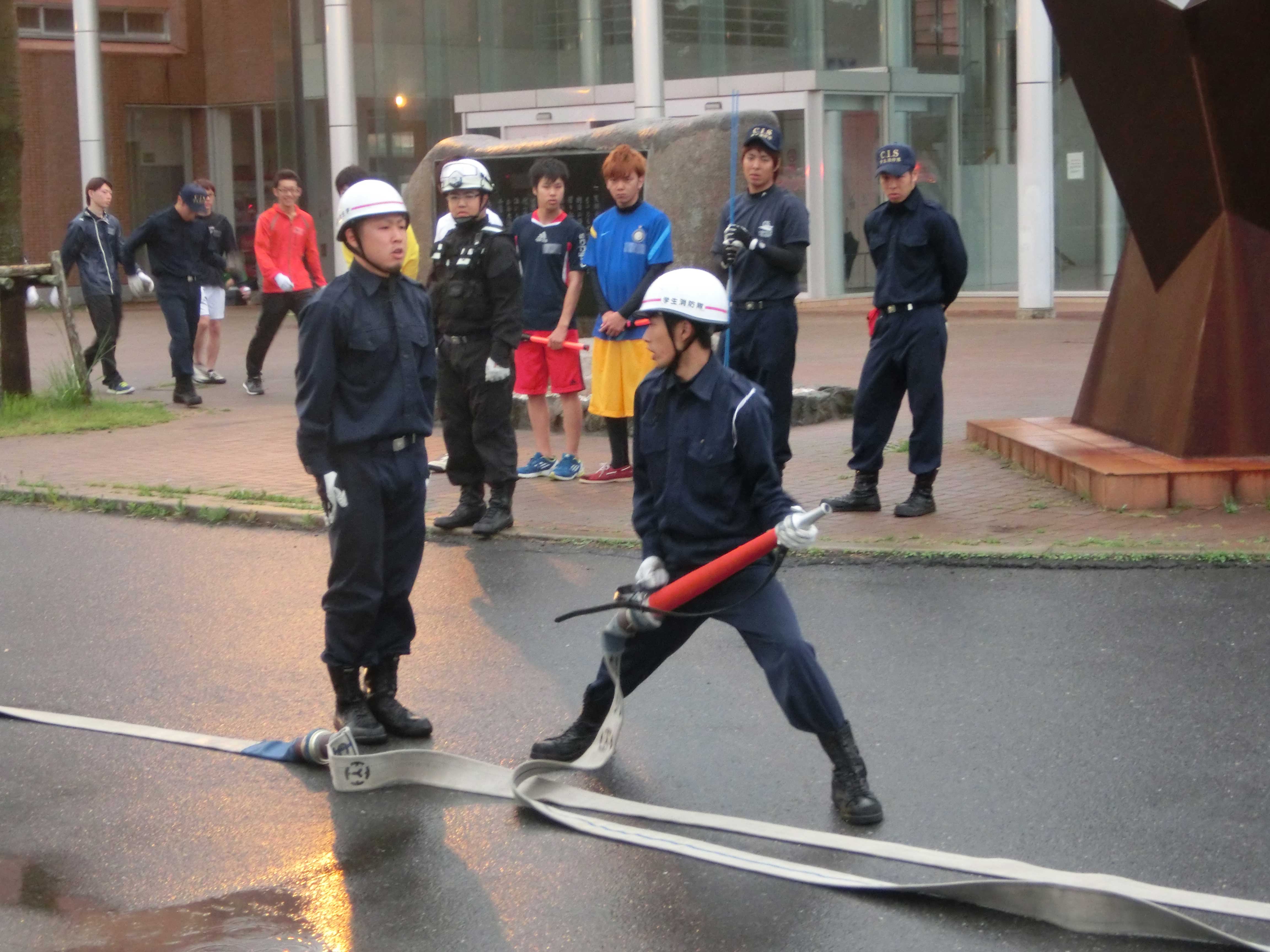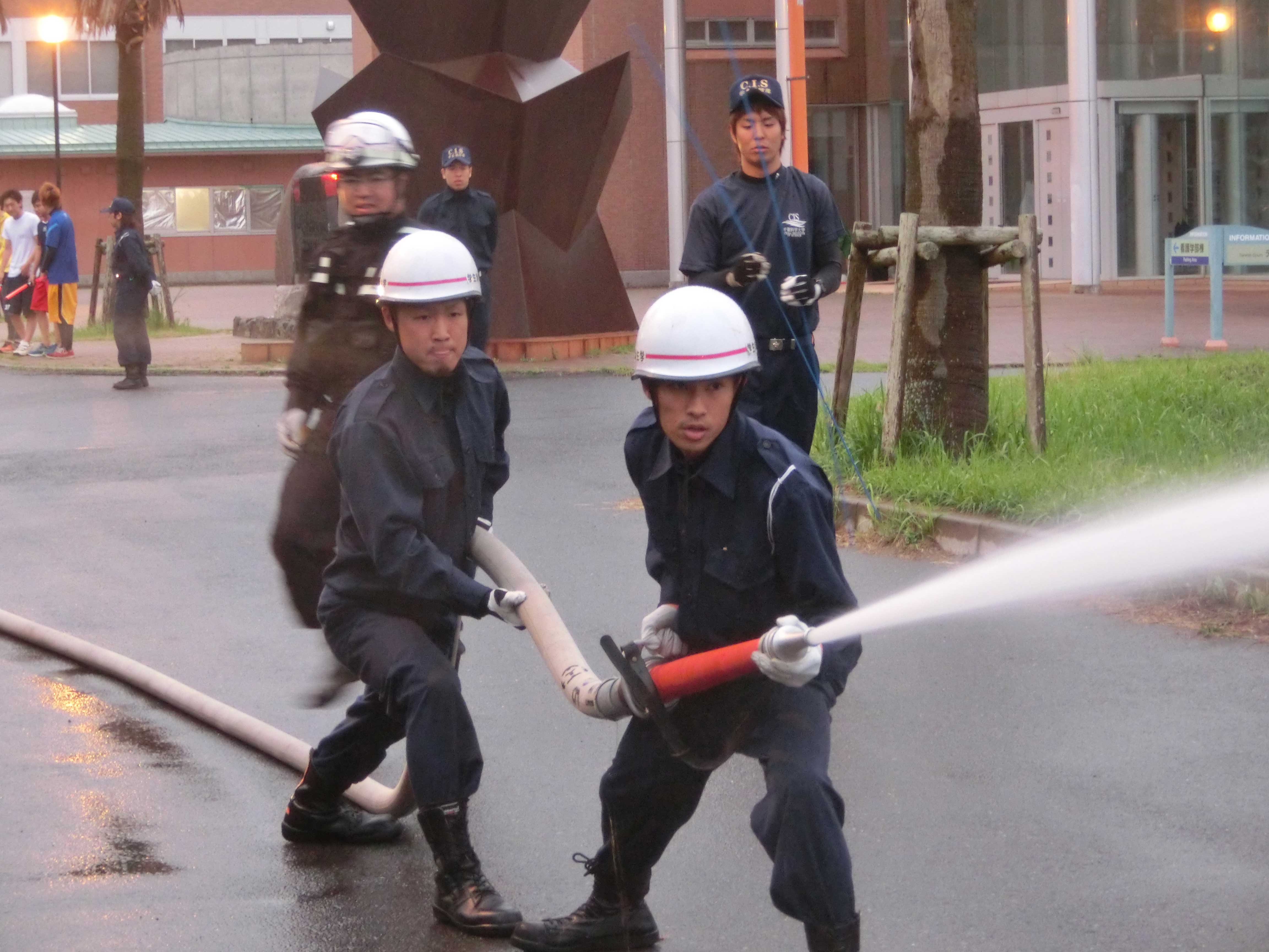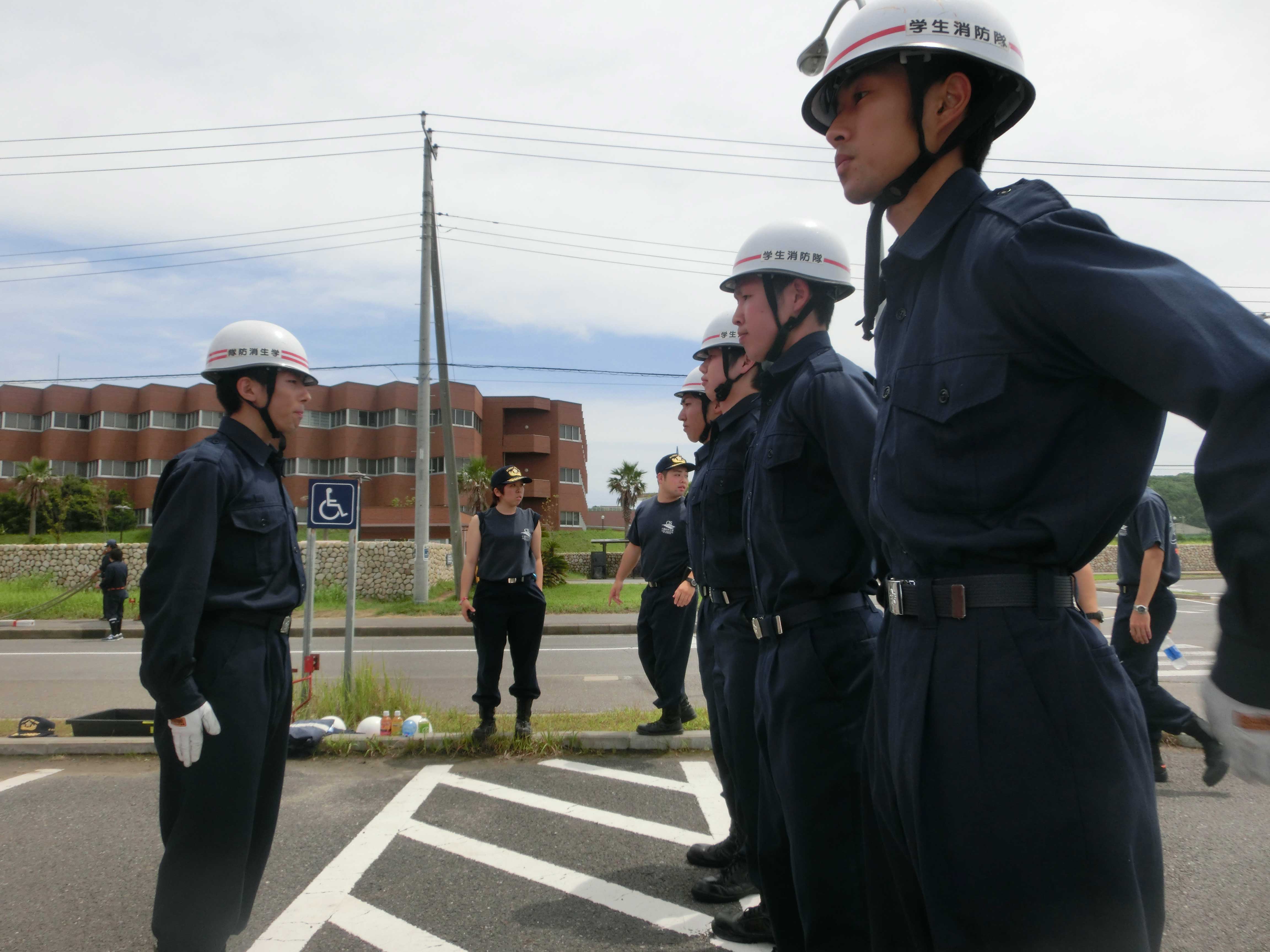 新入生達が 放水体験や消火器の使用体験を行い、隊員の先輩たちの規律訓練の様子の見学もしました。