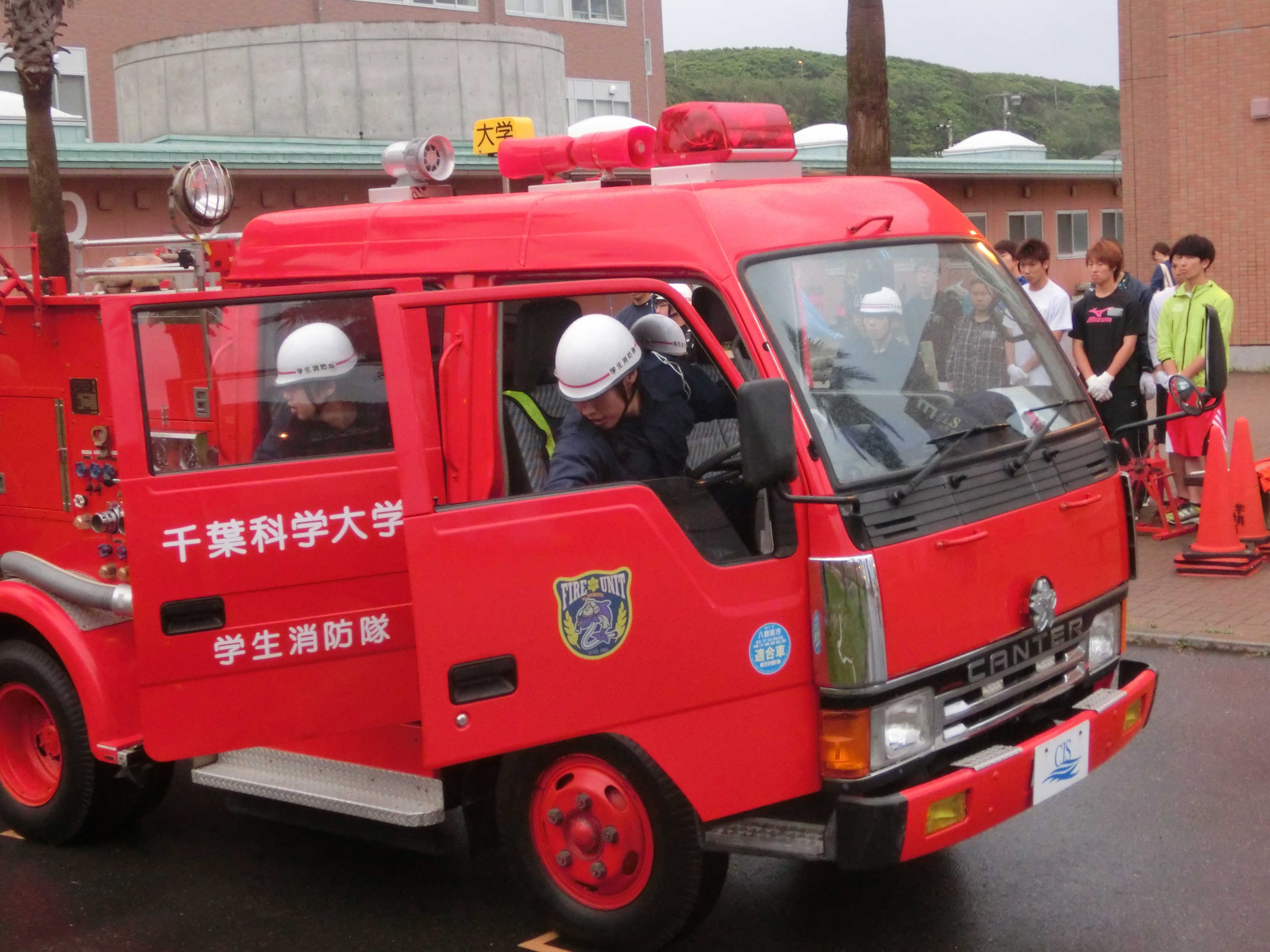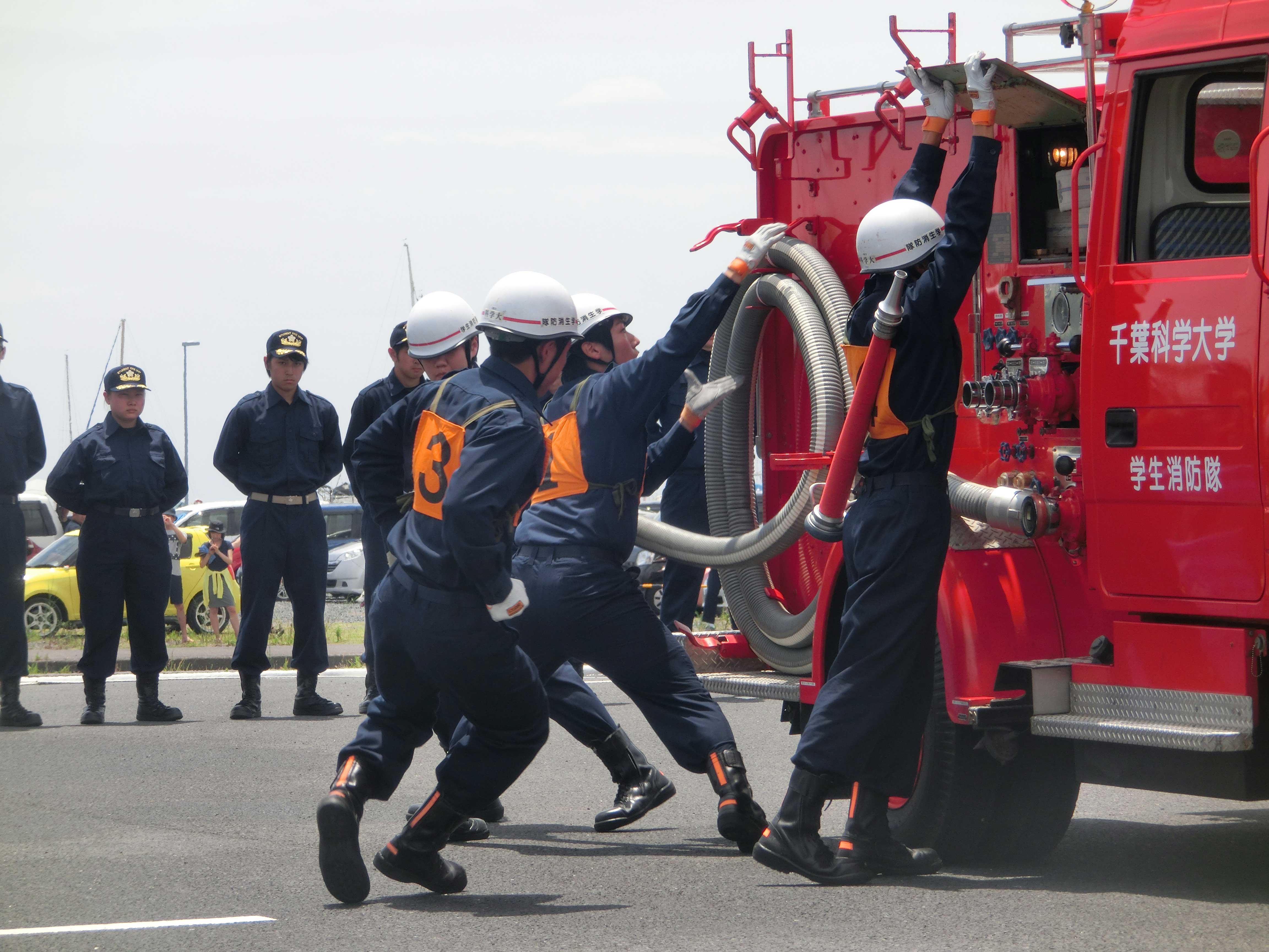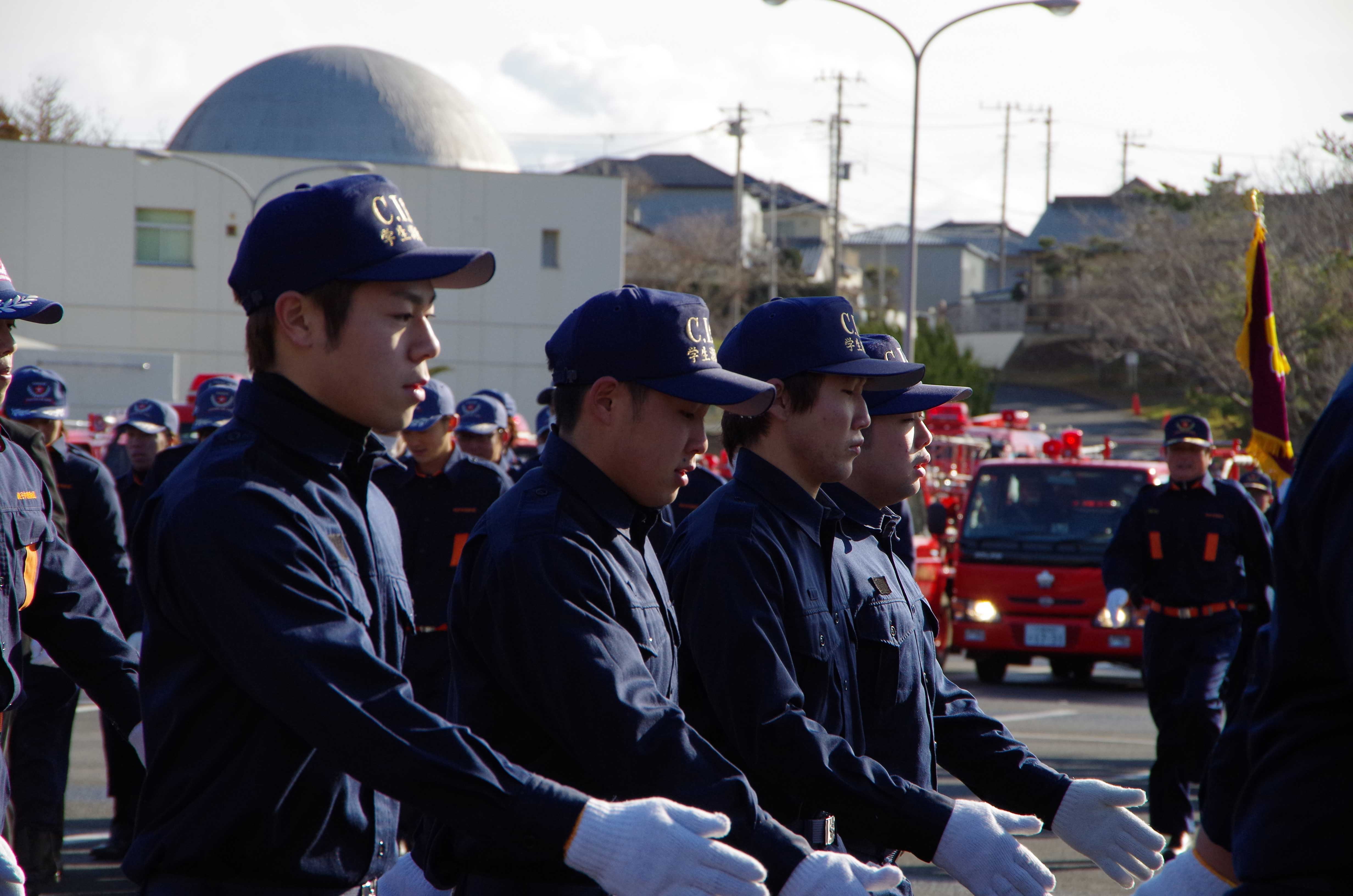 新入生達が 放水体験や消火器の使用体験を行い、隊員の先輩たちの規律訓練の様子の見学もしました。