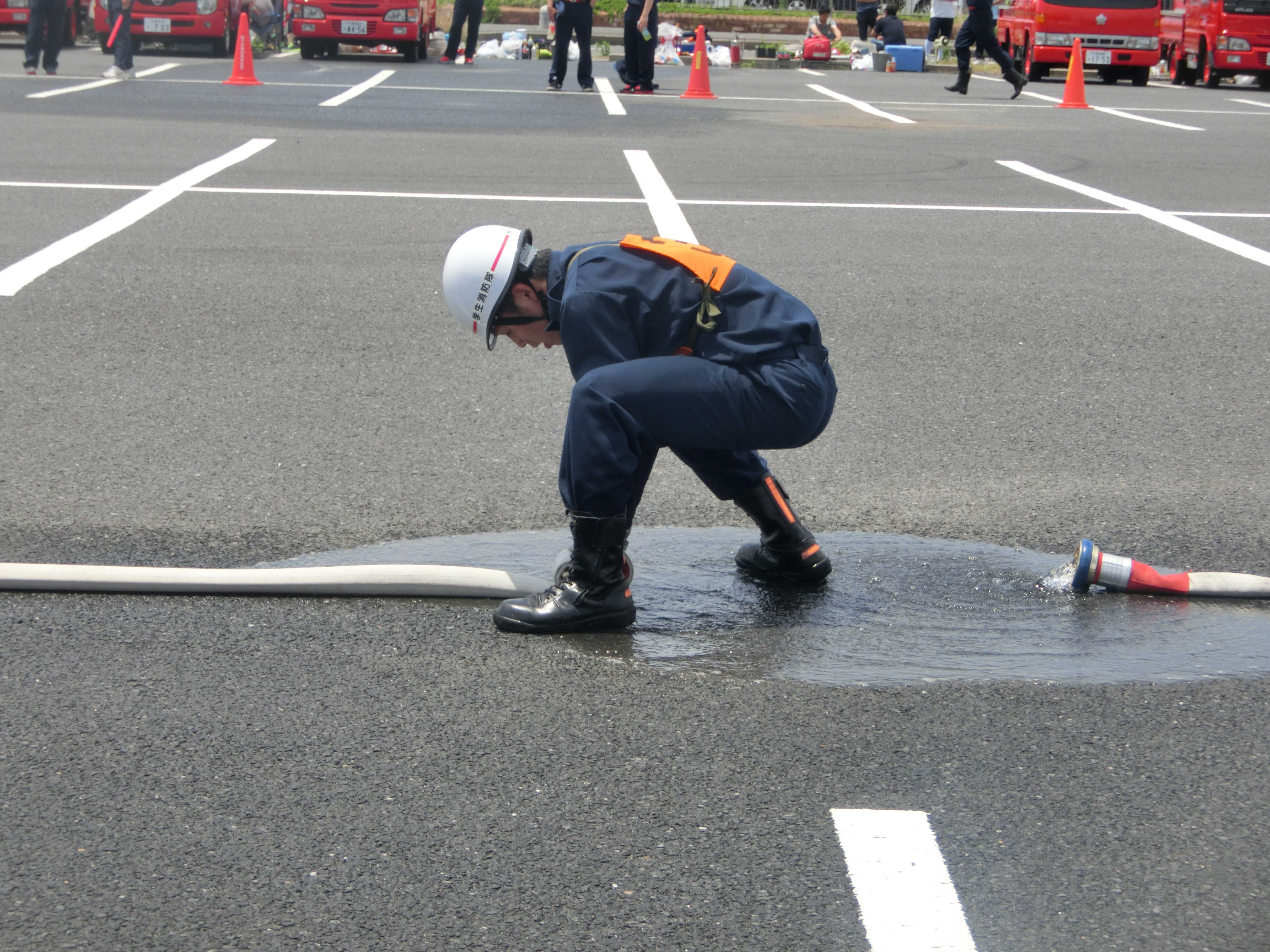 ↑放水体験にて隊員が筒先の持ち方を指導している様子。