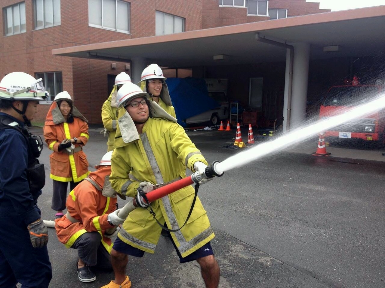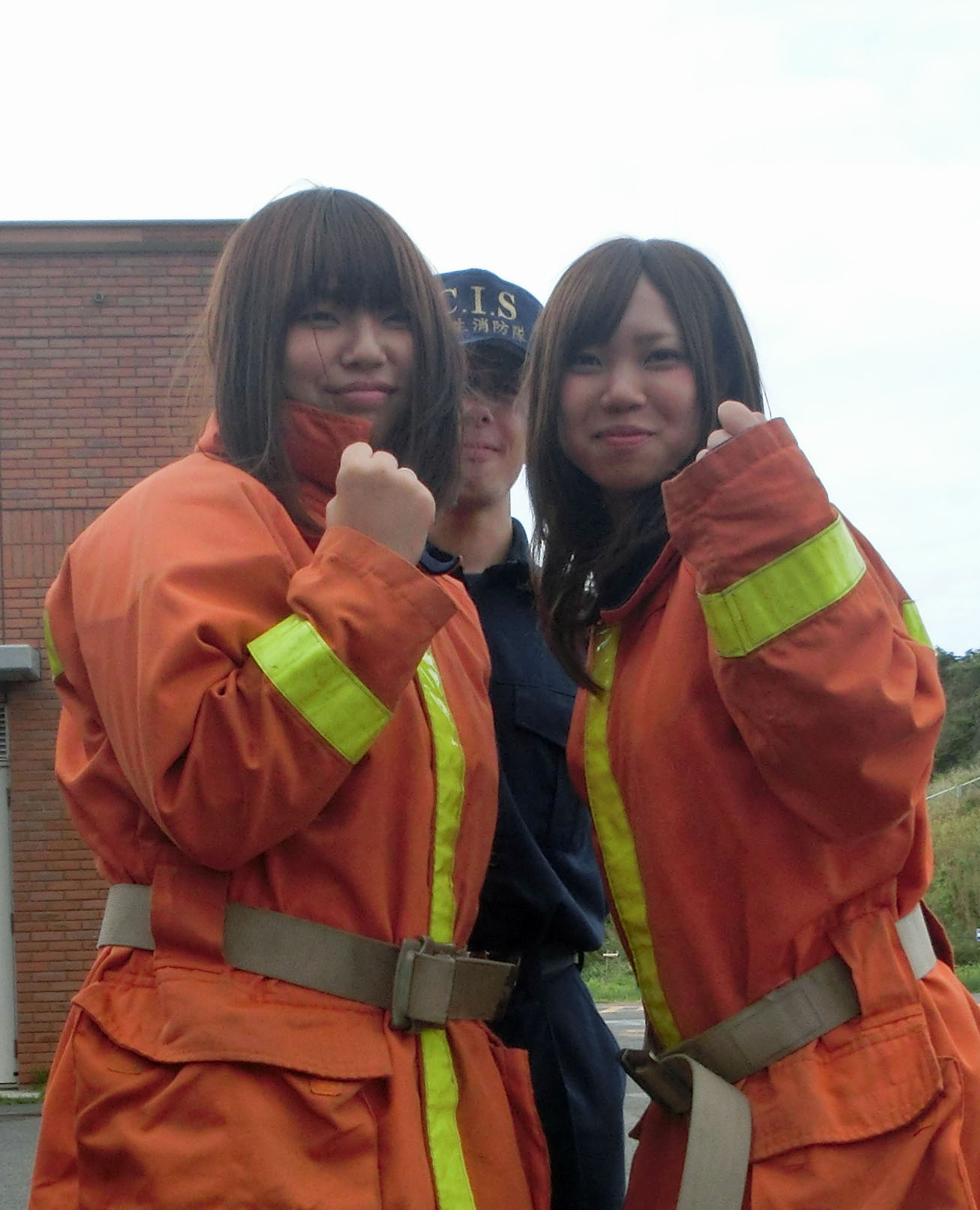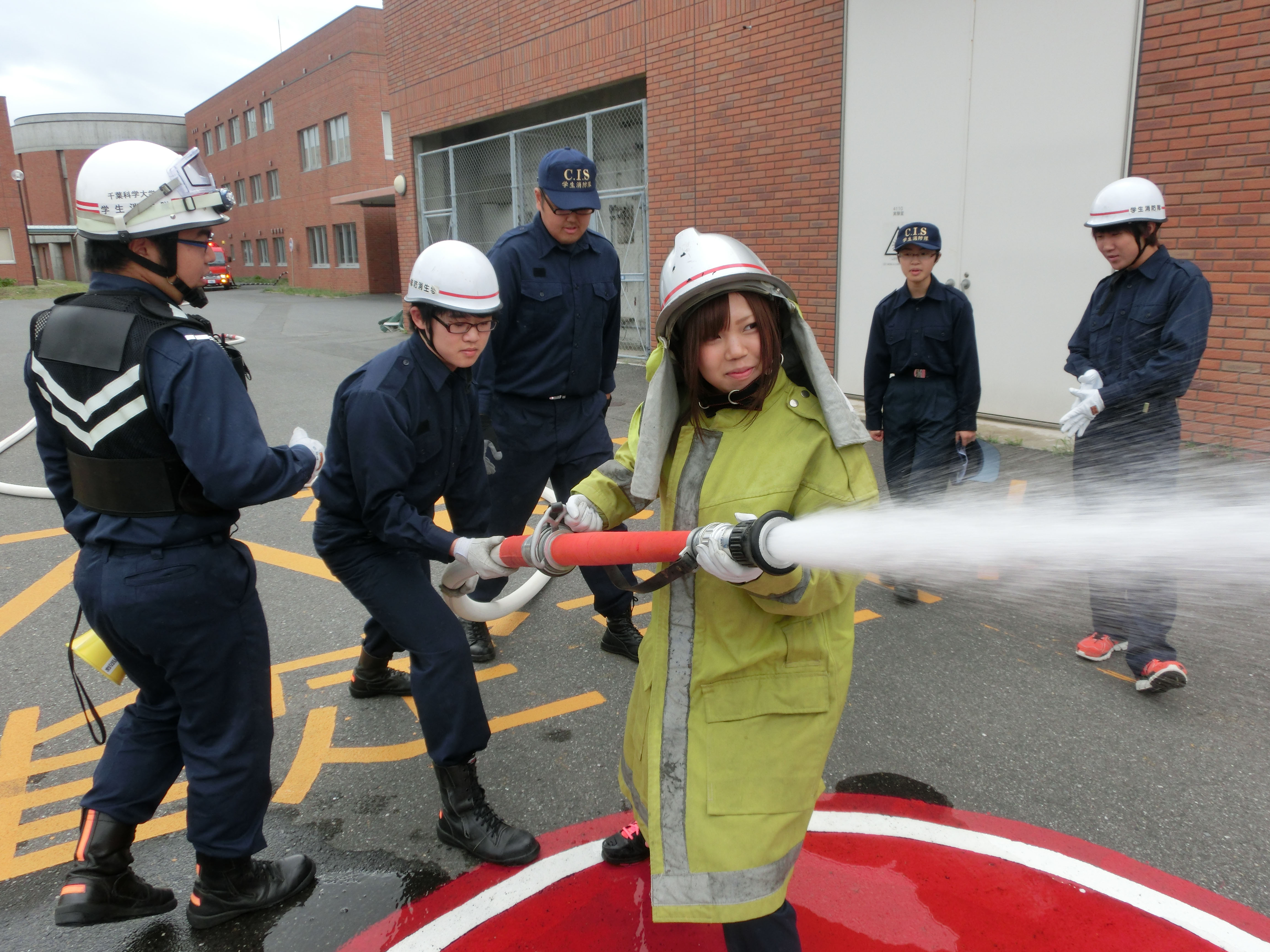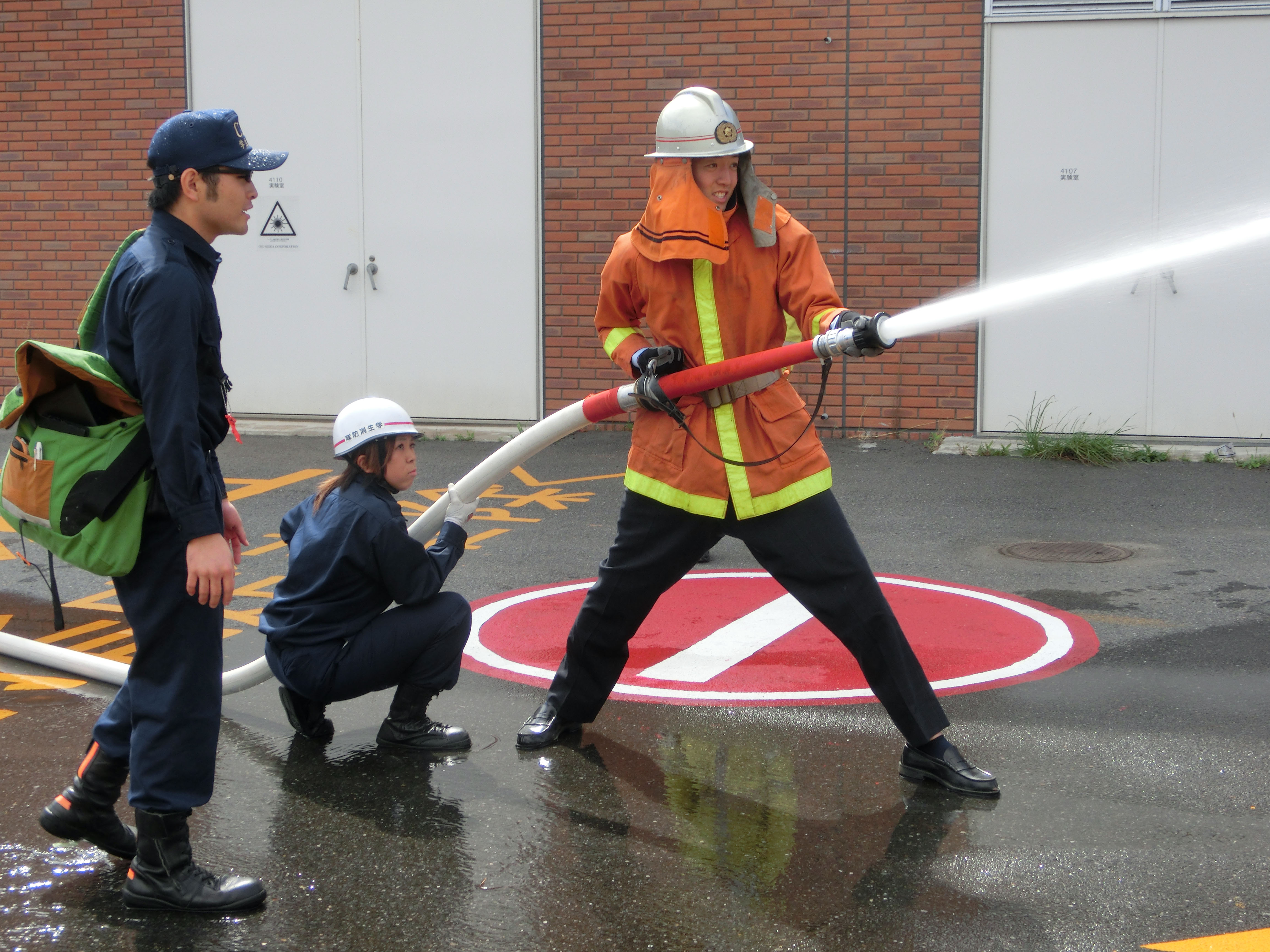 今日は、第四回オープンキャンパスが行われました! 季節の変わり目で肌寒い中、隊員たちは朝早くから活動を行いました。 四回目ということで、八月のオープンキャンパスより参加者は少なかったですが放水体験を実施しました。 ↑放水体験中 放水体験だけでなく、隊員たちは高校生の進路の相談にも耳をかたむけており、すごく頼もしい先輩の姿が見受けられました(^○^)! この体験を今後の進路などに役立ててもらえたら嬉しいです☆ ↑記念撮影 また今日はマネージャーも放水体験を行いました。 初めて持つホースは、とても重く感じました!! ↑放水体験 その後にはホース巻と、洗車を行い本日の活動を終了しました。 一日お疲れ様でした! 本日のオフショット ↑コスプレ(笑) マネージャー眞壁
