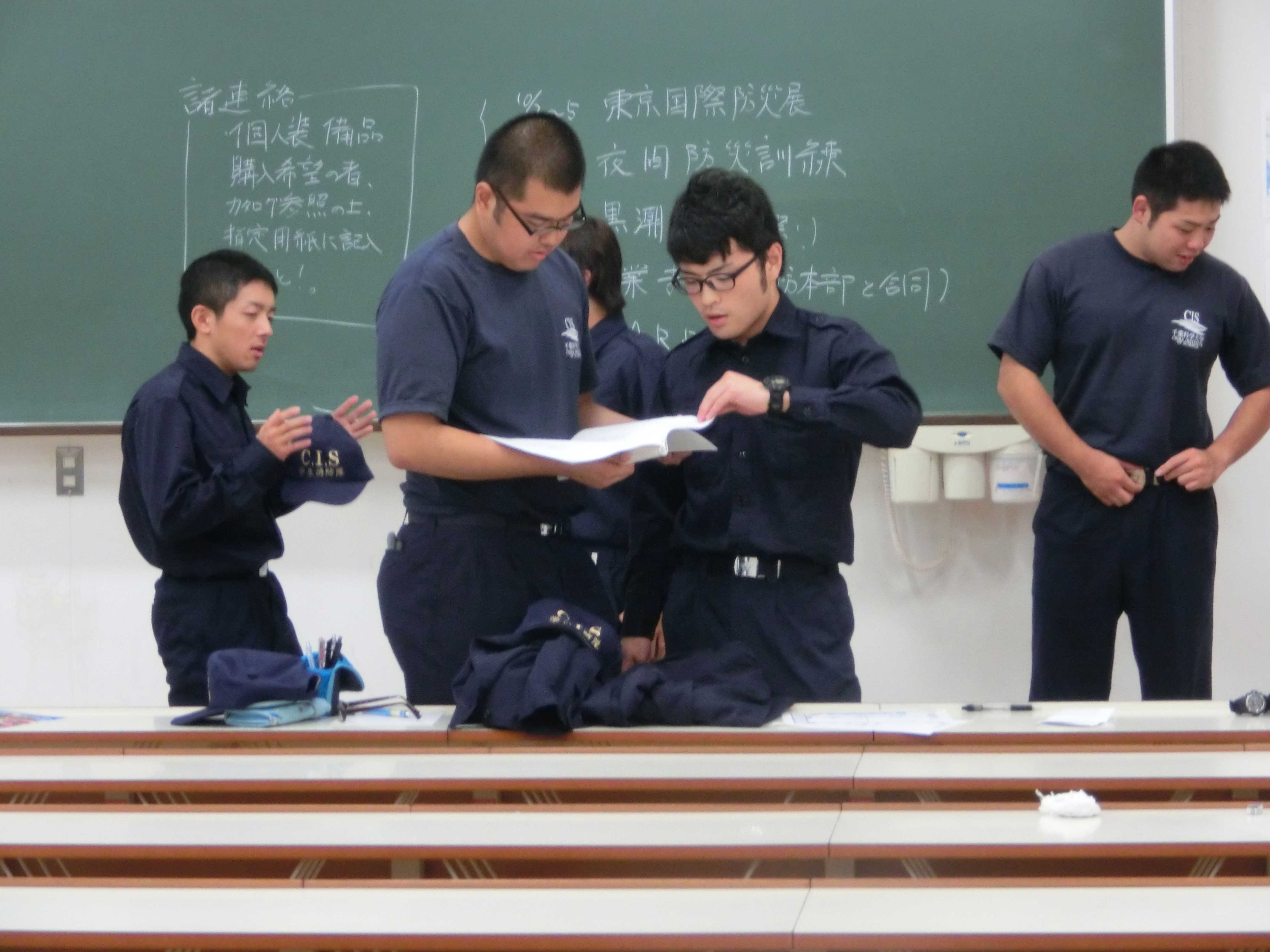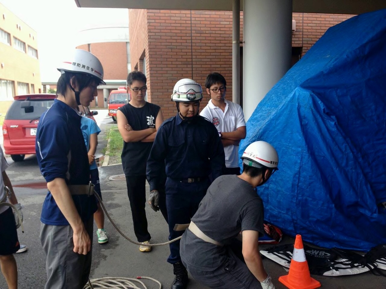 今日は、9都県市のリハーサルを行いました! 会場訓練(自助訓練、避難住民の誘導) ヘリポートの放水訓練 の、2グループに分かれて活動しました☆ ↑もやい結びの練習風景 会場訓練の自助訓練では、非常時に身の回りにある物でできる、 簡易避難、救助用品の作成を披露しました。 説明の配置やスピードなど本番に向けて練習、 見直しをしなければならないところが数点ありました。 なので、今日できなかったところを本番に活かしたいと思います。 声もあんまり出ていないと指摘を受けていたので 本番に期待したいです(^○^)! ↑会場の様子 会場は瓦礫の山が多数あり、想像以上のスケールで驚きました。 気になる方は、14日の9都県市に是非!足をはこんで下さいヽ(^o^)丿♪ リハーサルの活動が終わった後、 千葉県防災危機管理部の方の指導のもとレスキューハンマーを使っての 救出訓練をしました。 車のガラスは思ったよりも固くて割るのも大変そうでした。 本番の9都県市まであと2日とせまっているので 学生消防隊の皆さんは、体調をしっかり整えておきましょう! マネージャー 高木