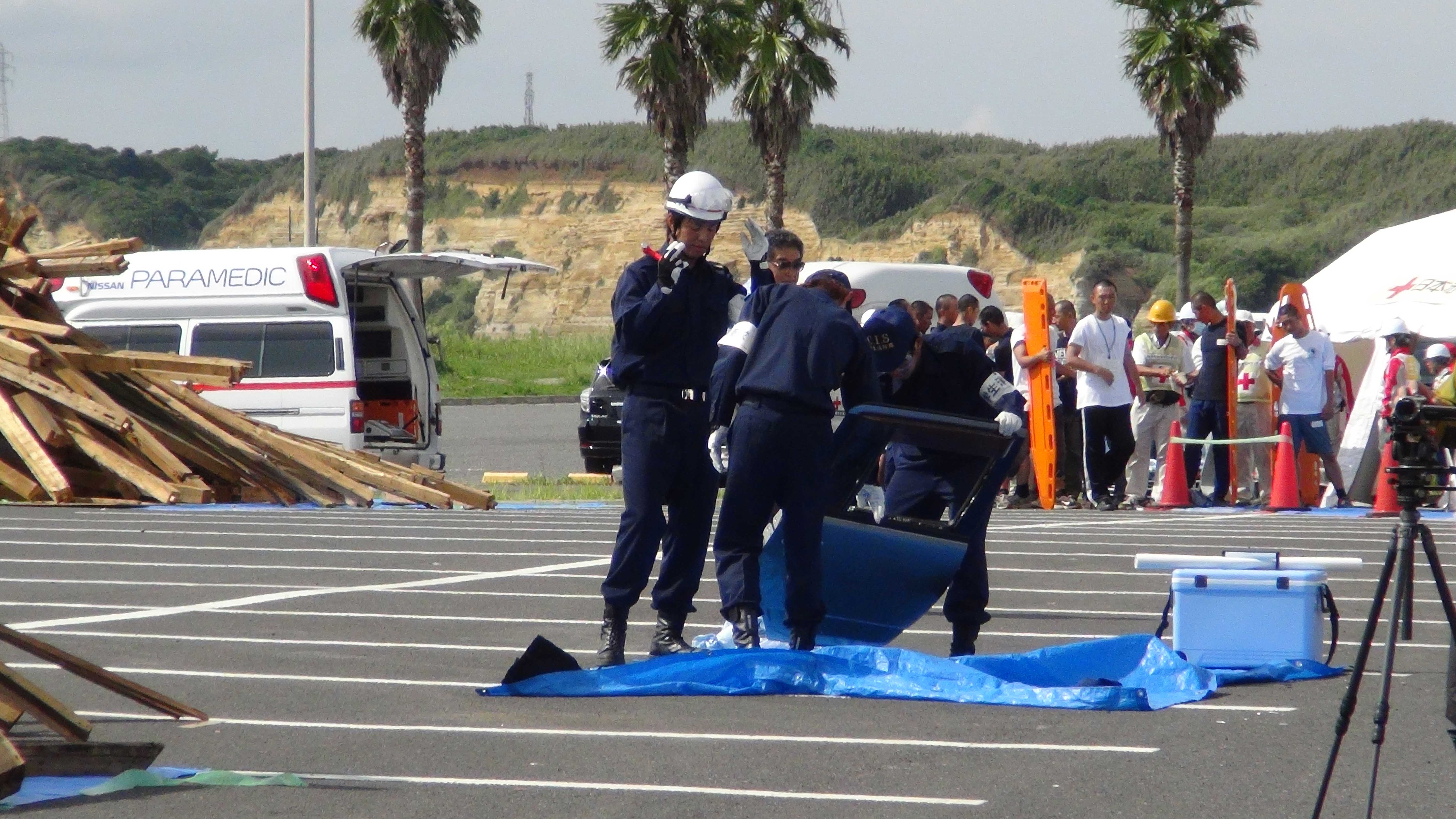 今日は千葉科学大学前で九都県市合同防災訓練が開催されました。 ↑市民の避難誘導状況 私たちは訓練ではヘリポートの散水・自助の訓練・火災防御訓練の3パートを担当させていただきました。 まず、ヘリポートへの散水は私たちの消防車を使って散水を行いました。 着陸にちょうど良い湿り具合にするのに、泥だらけになりながら頑張っていました! そして、自助の訓練では学生消防隊のみでメインステージに登場し、災害時に必要な技術を披露しました。 ↑最終ミーティング ↑レスキューハンマーシーン 来賓や関係者の方々には参考になったと思われますが、私たちとしてもかなり勉強になりました。 初めて学ぶことばかりで、とても新鮮味があり楽しかったです。 最後に火災防御訓練を実施しました。 実際に火災が起きた想定で、私たちと銚子市団、銚子消防本部の連携で消火まで訓練を行いました。 パートの中でできることを団と決め、スムーズに連携がとれるように尽力しました。 ↑吸管から展開状況 おかげで、実際に発生した場合でも効率よく対応できるように努めます。 また、展示ブースでは学生消防隊と学生警察支援サークルスターラビッツのブースを設けていただき、たくさんの方々に学生消防隊を知っていただくことができてうれしかったです。 ↑当日の展示ブース状況 来て下さった方々、本当にありがとうございました! そして、不快な思いをされた皆様申し訳ありませんでした。 来て下さったより多くのお客様にきちんとわかりやく展示できるように、さらなる創意工夫を凝らしていきます。 今年度も九都県市合同防災訓練に参加させていただきありがとうございました! とても良い経験になりました。 おかげで、成長することが出来た気がします。 これからも学生消防隊をよろしくお願いいたします。