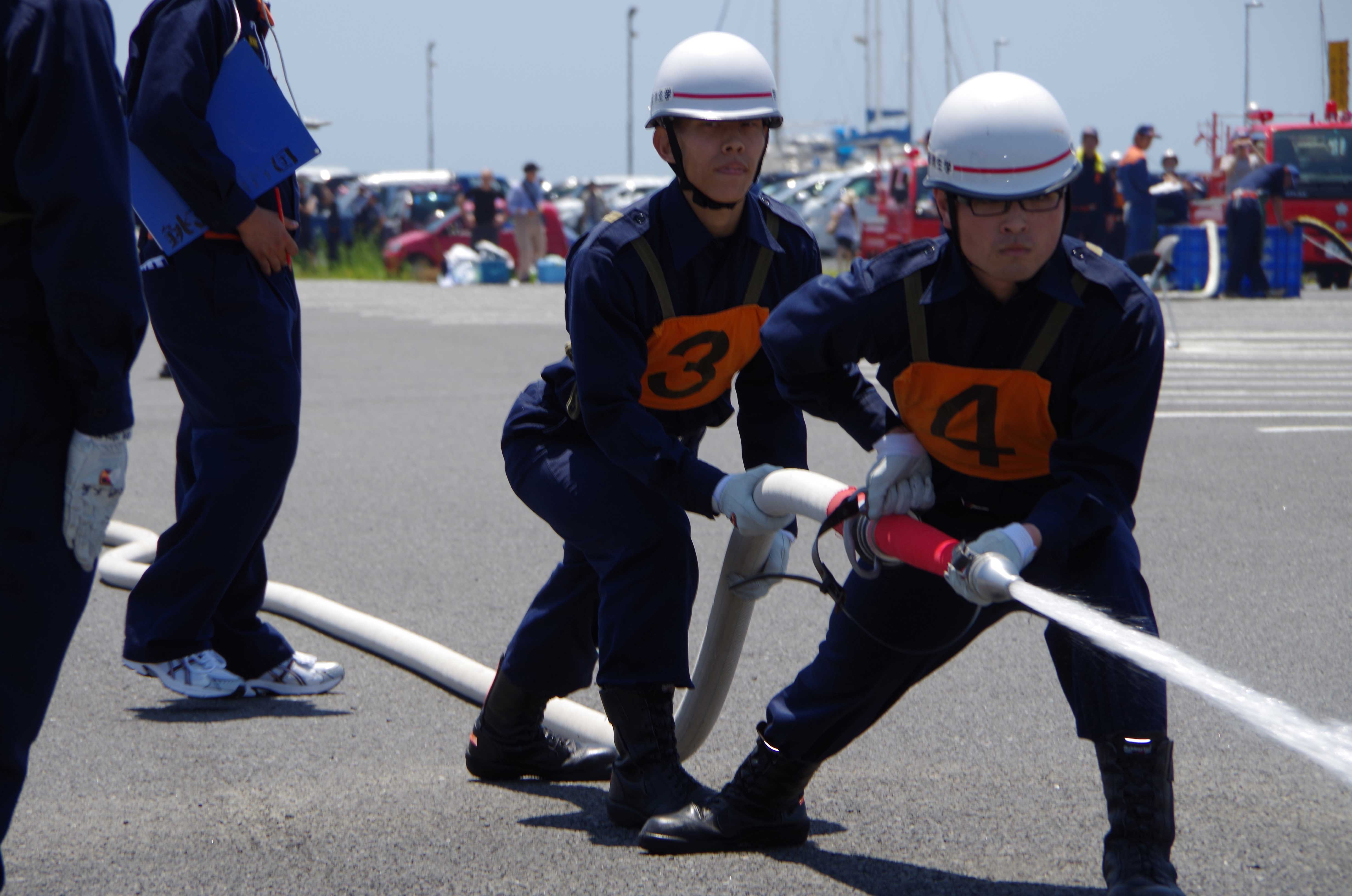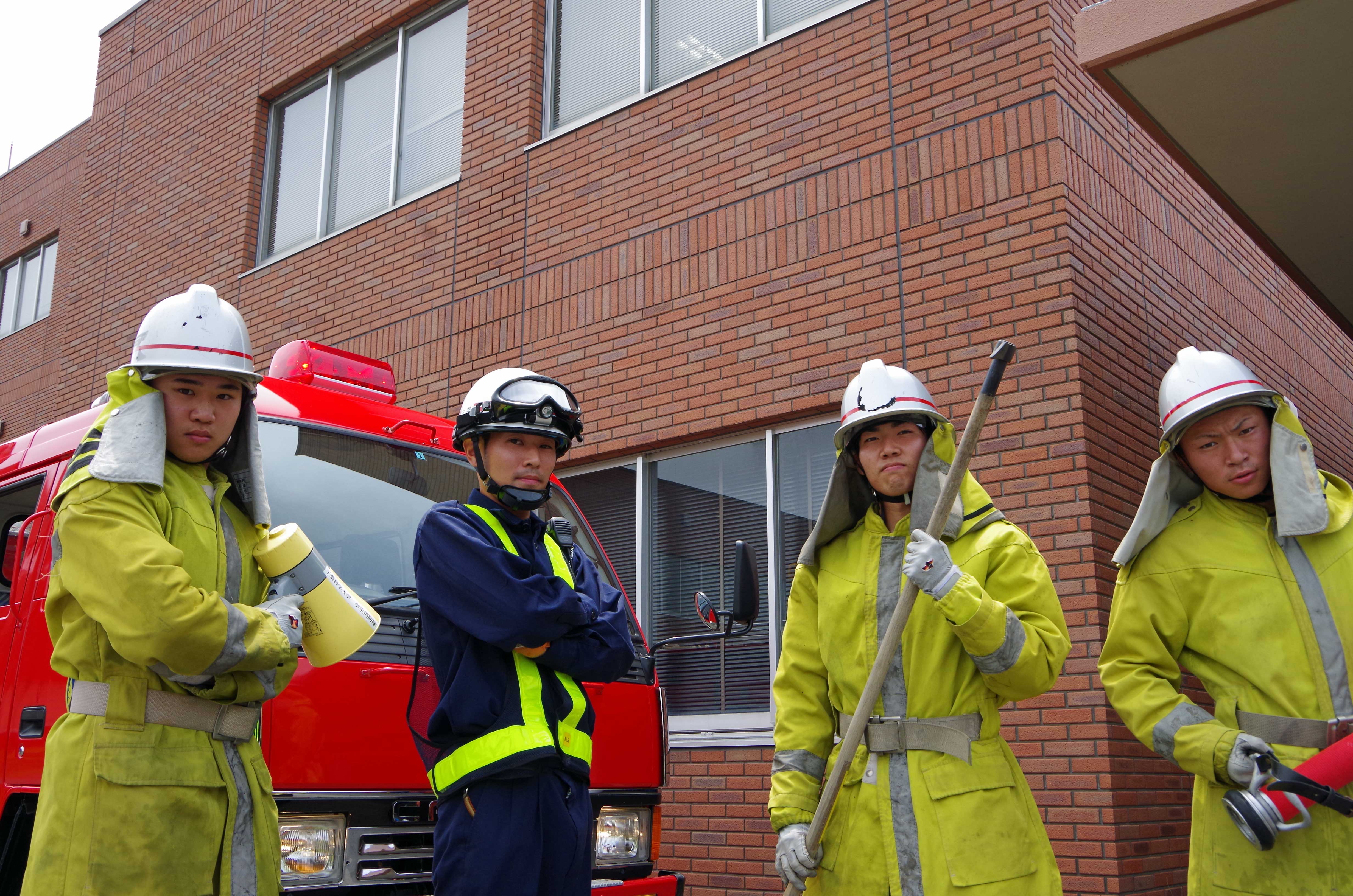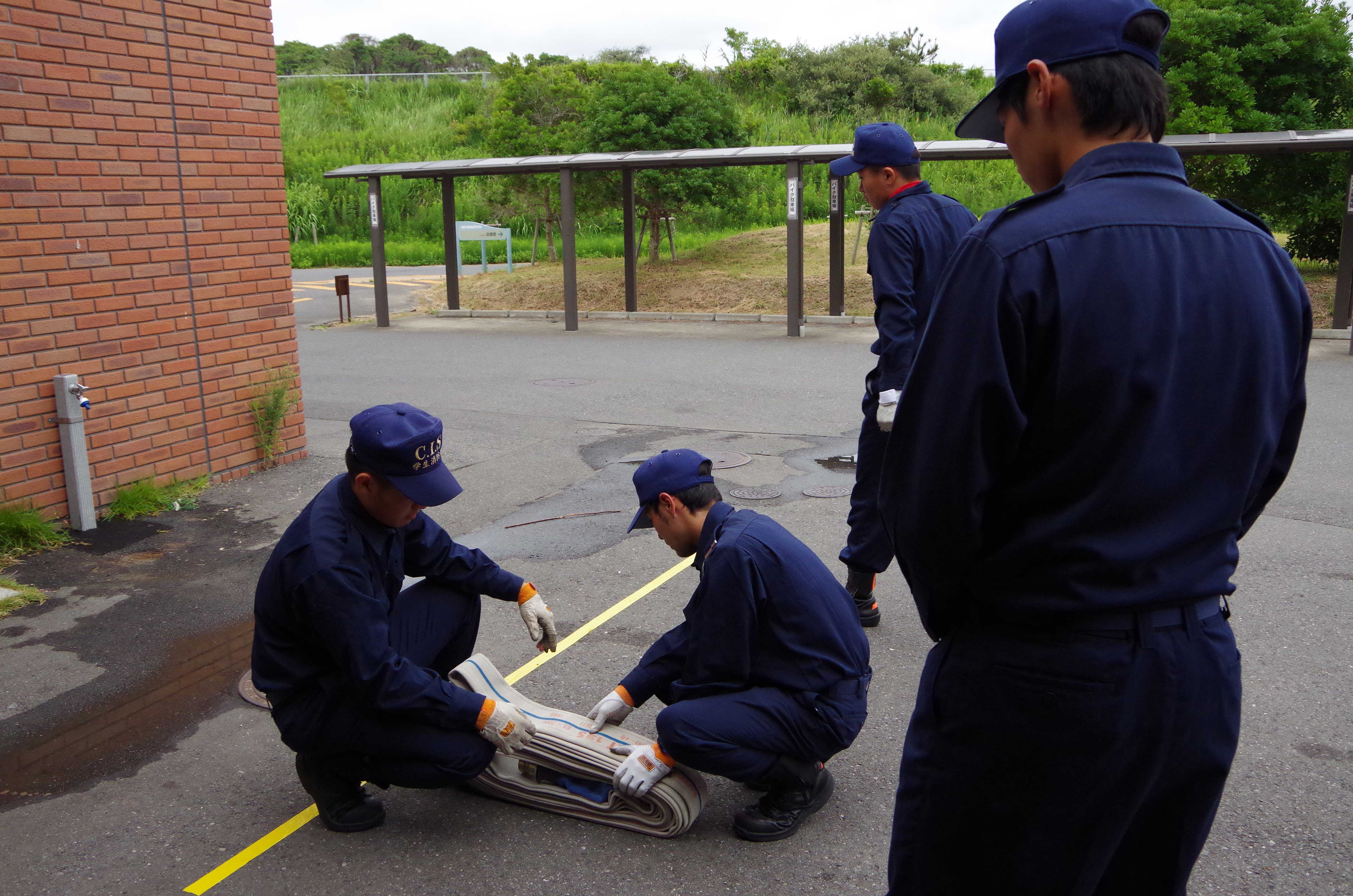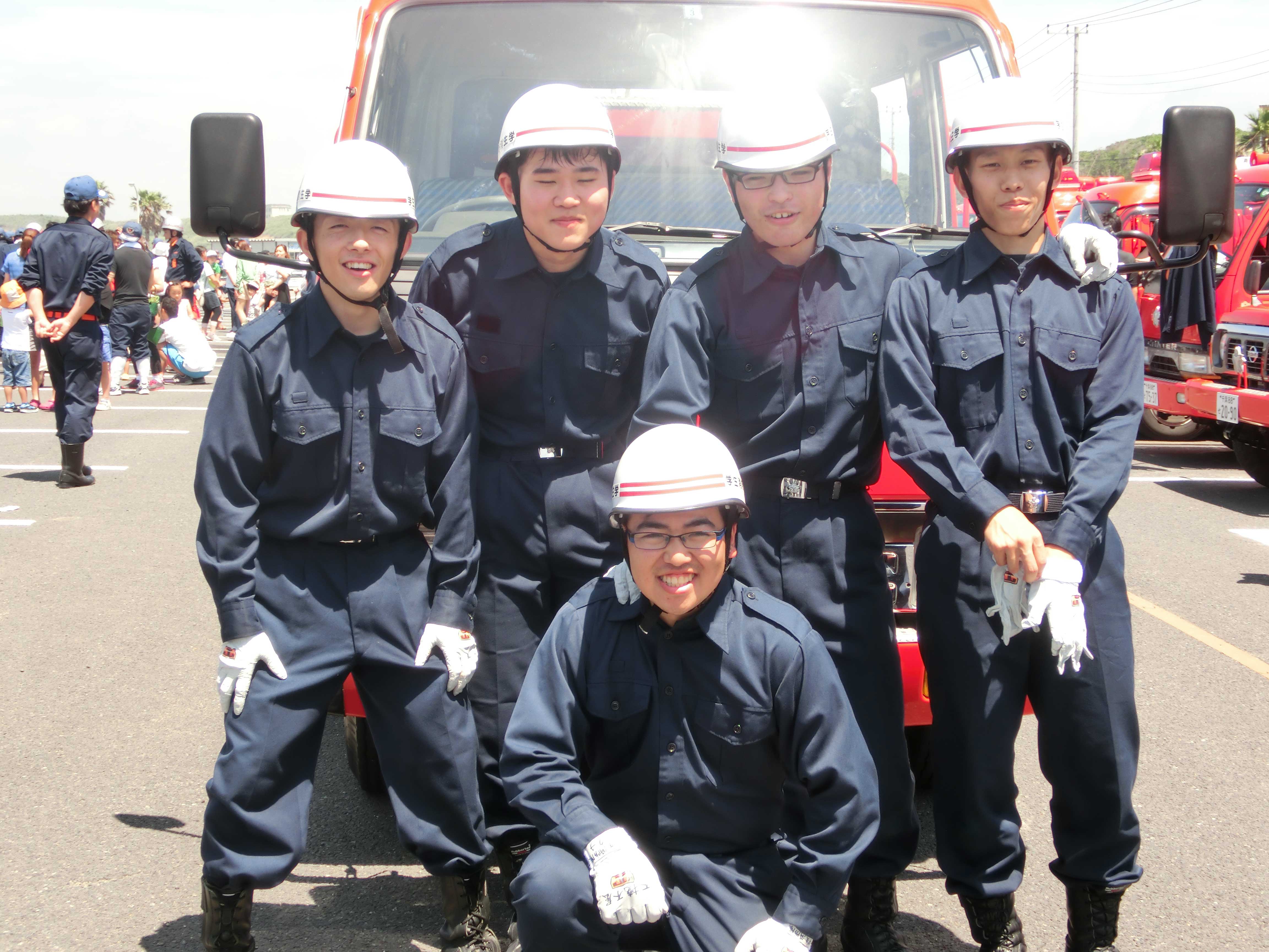 今月28日の日曜日に、オープンキャンパス2日目が行われました。 内容は昨日と同様に「災害救助演習」と「放水訓練」を実施しました。 災害救助演習では学生消防隊と学生警察支援サークルスターラビッツ(以下SRと略する。) まず、災害救助演習では1日目の反省点を改善し、各々が満足いくように訓練することができました! ↑ポンプ隊の放水訓練状況 以下のメンバーが、各ロールを担当してくれました! お疲れ様でした!! ↑ポンプ隊のメンバー ↑レスキュー隊のメンバー ↑学生消防隊役のメンバー ↑傷病者役のメンバー ↑警察官役のSR隊員メンバー 続いて、放水訓練では日中最も熱くなる13:00ごろから開始しましたが、たくさんの来場者が来てくださいました! ありがとうございました!感謝です!! 内容としては、放水体験や呼吸器着装体験などを実施し、楽しんでもらいました。 ↑防火服装着の状況 また、種明かしパート2として、体験にあっては指導が1年生メインの2、3年が安全管理というロールで実施しました。 1年生は普段の訓練で学んできたことを体験者に教えている姿は、上級生としては素直にうれしかったです。(笑) ↑放水体験の指導状況 しかし、まだまだ自主性がないのとメリハリのない隊員もいてまだまだ指導の必要性を感じました。 オープンキャンパスを終え、様々な想いをした隊員は多かったと思います。 特に1年生は自分のレベルがいかに低いか、そして学生消防隊の隊員としての責務などを実感したと思います。 成長著しい彼らに、今後も期待です。 ↑車庫前にて記念整列写真 ~今日のオフショット~ ↑頭下げて、、? 上の写真は別に頭をさげている訳ではございません(笑) これはOBのK先輩がいらっしゃったときの挨拶シーン。 声は大きく、きちんと頭をさげて挨拶している彼らはサイコーです。 驚いているのか、先輩も苦笑いでした。(笑) それと、イベントがある度に銚子まで足をお運びいただき感謝しています。 本当にりがとうございます。 先輩の築きあげてきた学生消防隊をさらに良くしていくように努めてまいります。