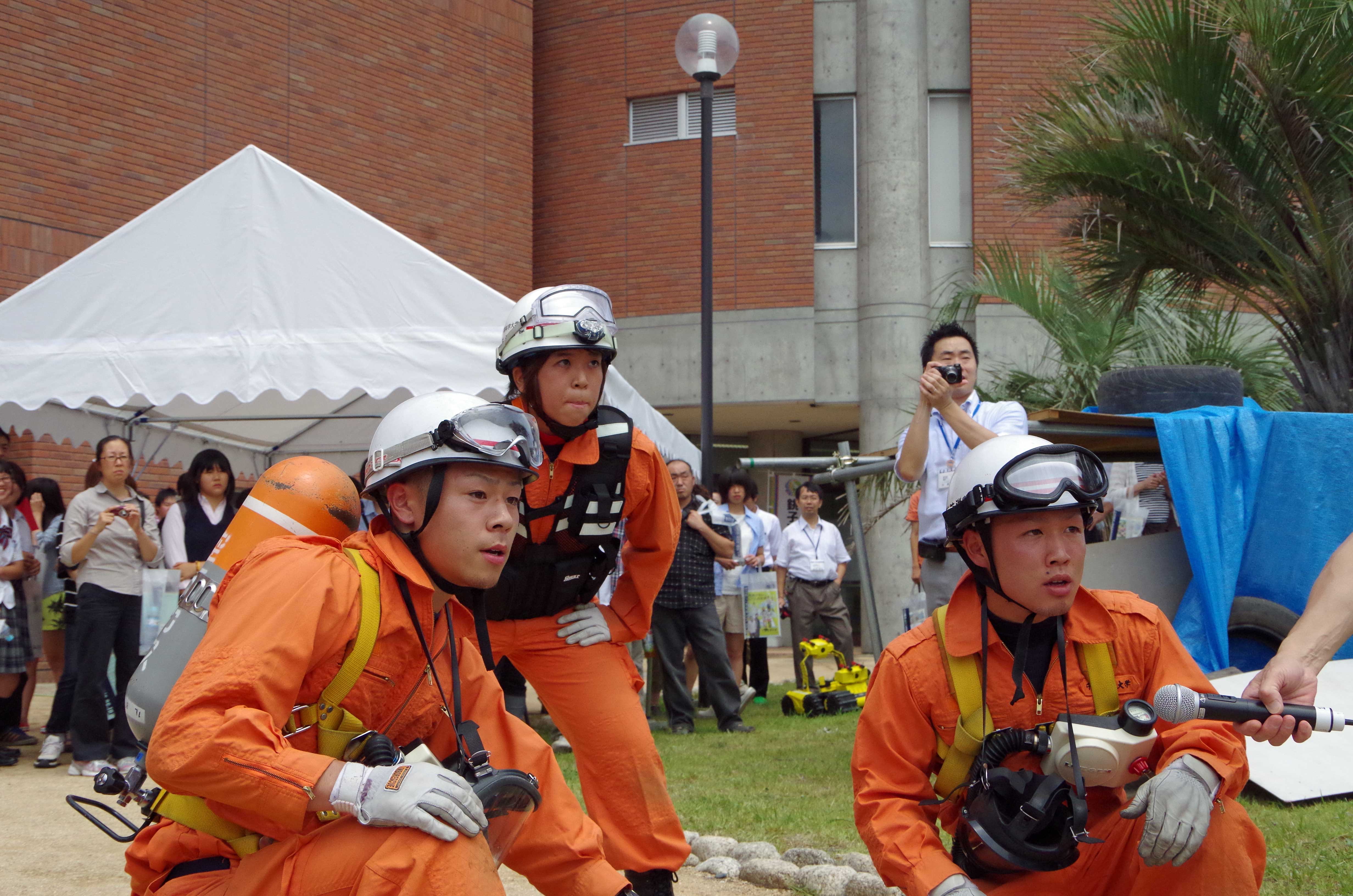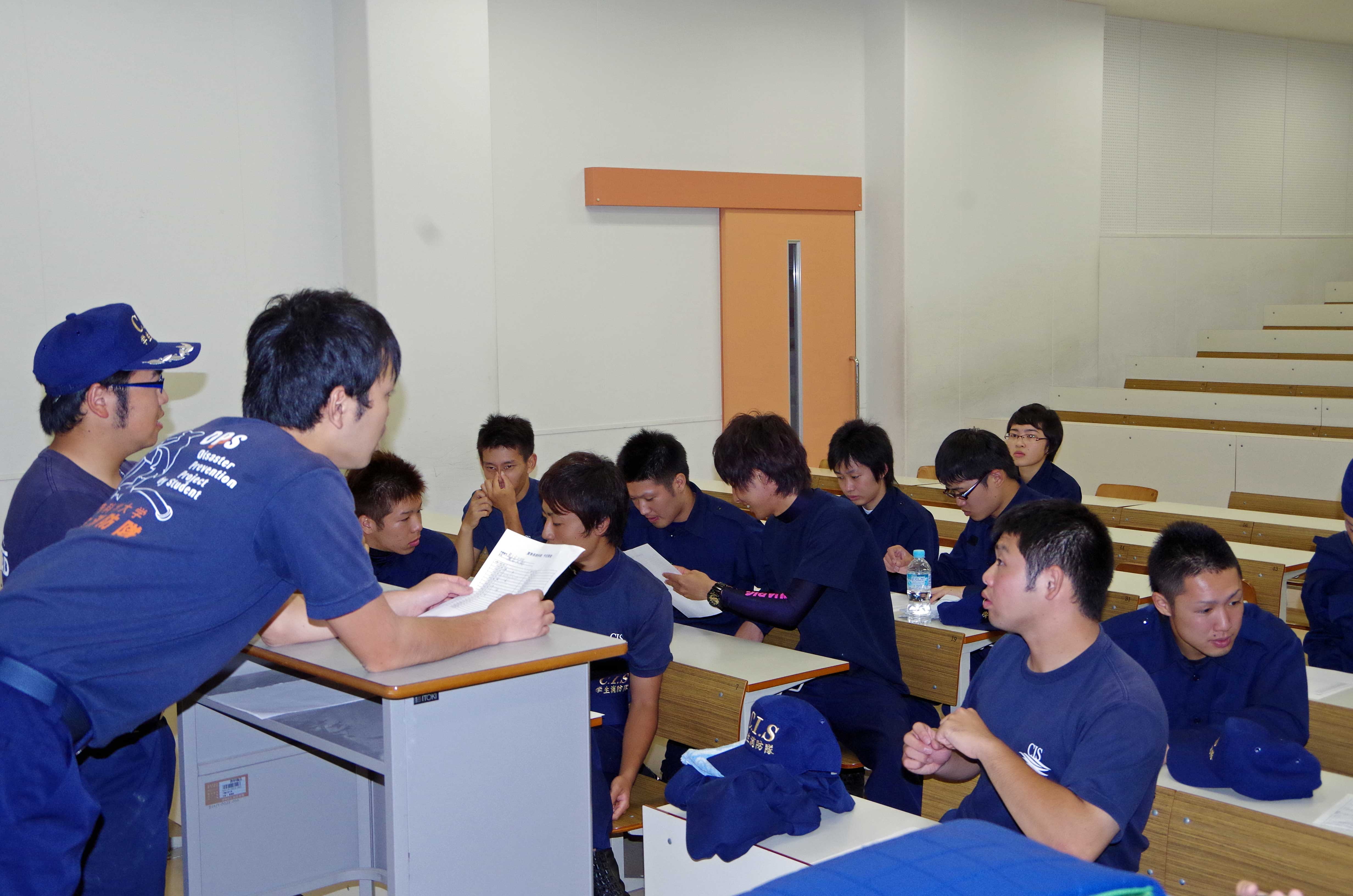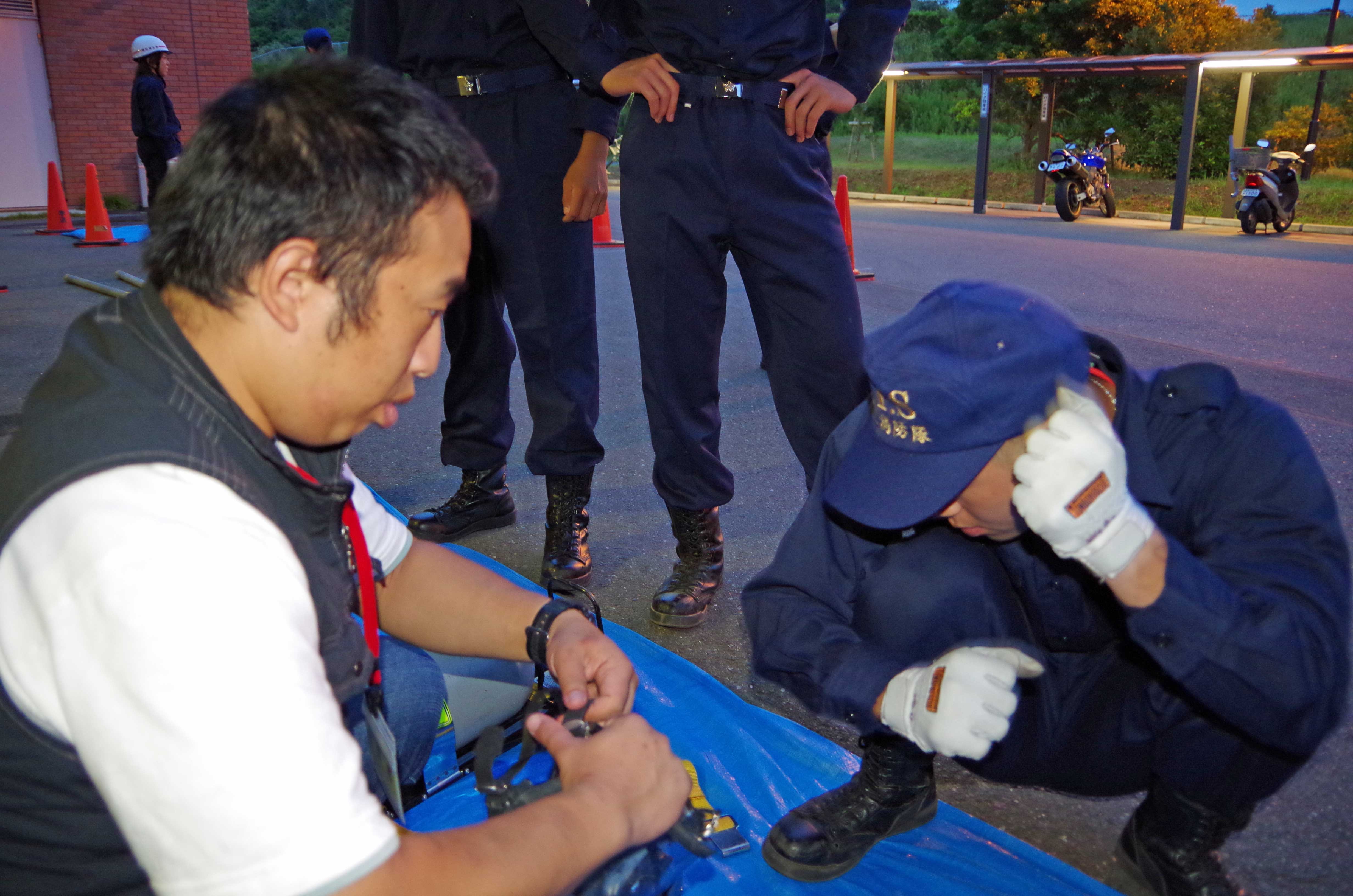 昨日はオープンキャンパスでの模擬訓練と警備訓練を実施しました。 ↑シナリオ打ち合わせ オープンキャンパスでは常備消防隊と救助隊、学生消防隊に分かれ各々のパートごとに訓練を行いました。 ↑ホース収集訓練 ↑呼吸器の装着訓練 新入隊員は初の訓練内容に興奮を隠しきれてない様子でした。(笑) また、酸素ボンベを背負ったときの表情はとてもいい顔していました。 その後、20日の浅間神社祭りに向け警備訓練を行いました。 初の警備活動を行う上で、必要な知識を実践形式で訓練をしました。 ↑警備訓練の活動状況 慣れない警備方法に困惑している隊員もいましたが、副隊長の指導力が高いおかげか真剣に取り組み、納得できるよう質問をし身につけられるよう努力していました。 入隊してから約3か月経つ新入隊員は、返事をしっかりするようになり、メリハリを徐々につけ、規律も覚え始めもうすぐでスタートラインに立てそうな気がしてきました。 成長し続ける彼らを温かく見守ってください。 ~オフショット~ 昨日の訓練では久しぶりに先輩方がいらっしゃり、戯れました。(笑) ↑下剋上なうww なぜか先輩がいると不意に甘えてしまう3年生の姿がそこにありました。