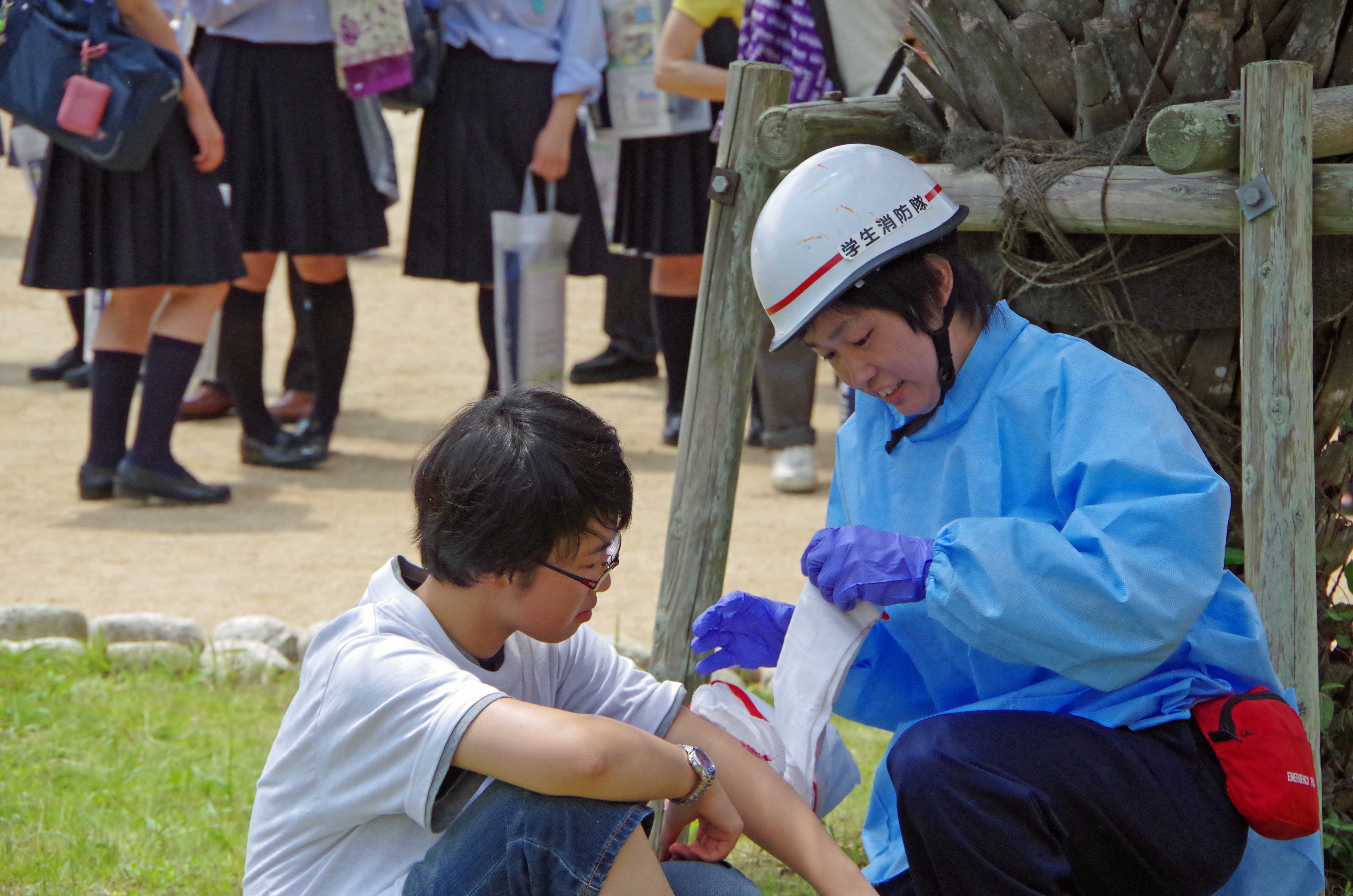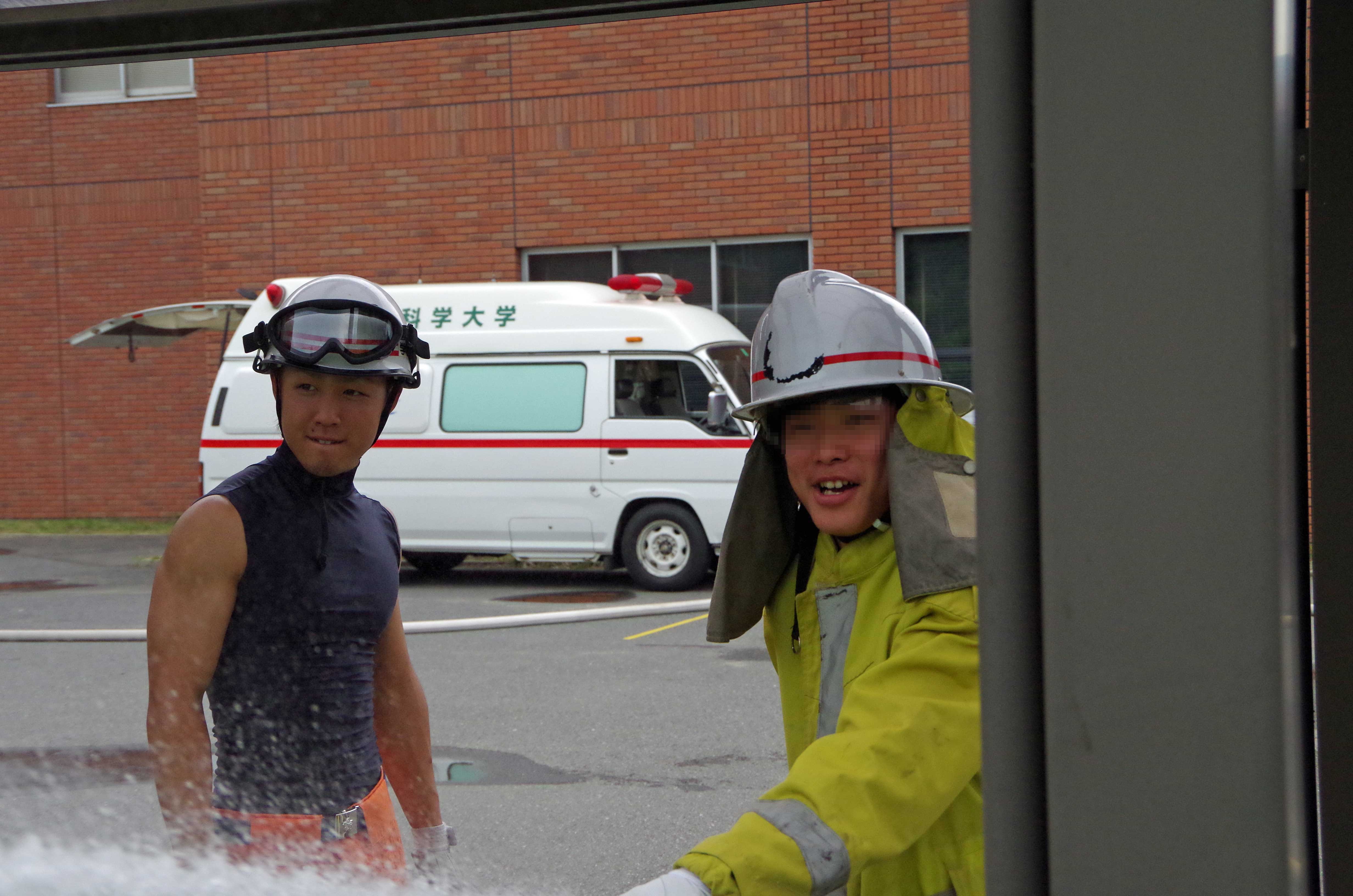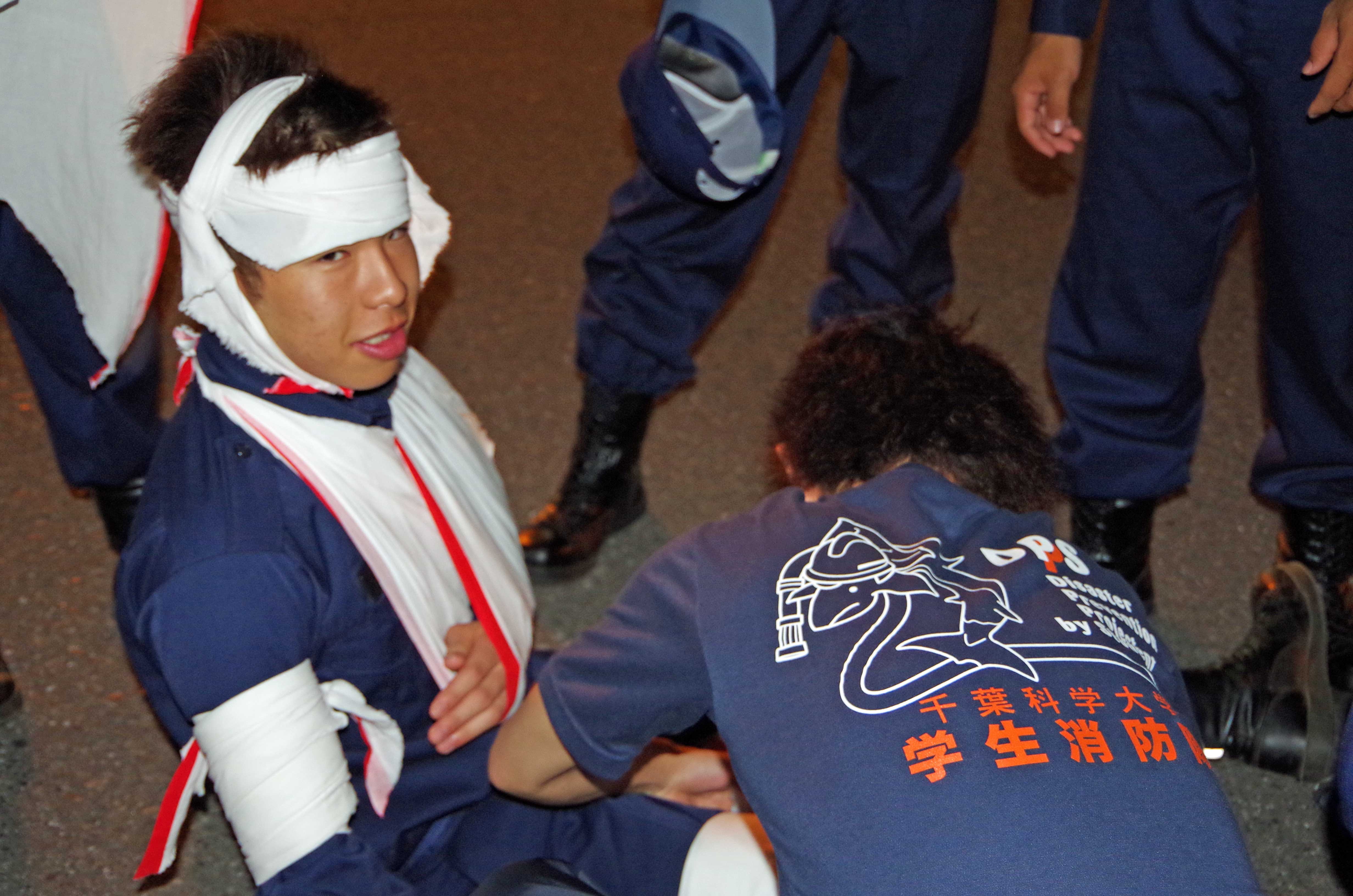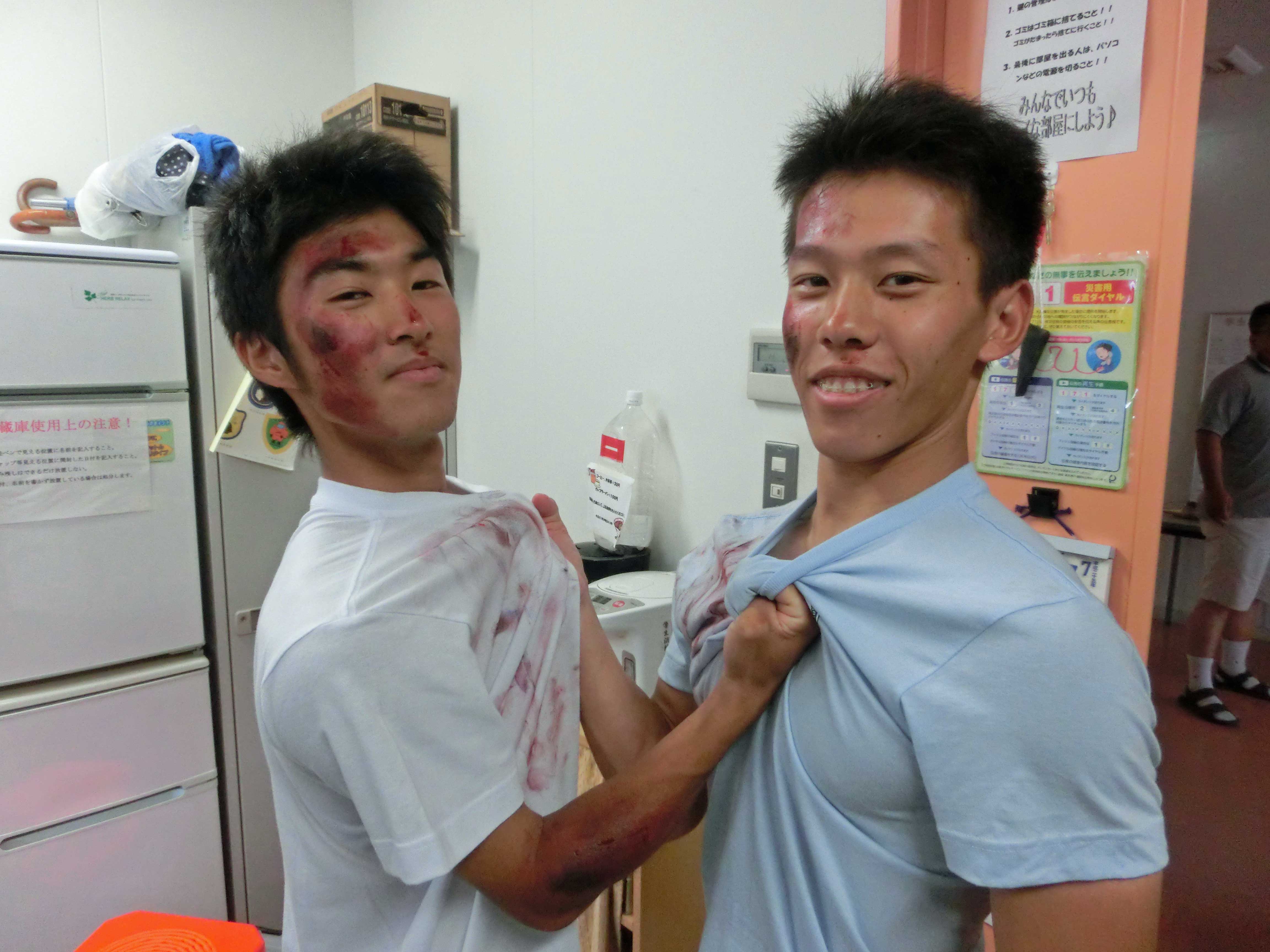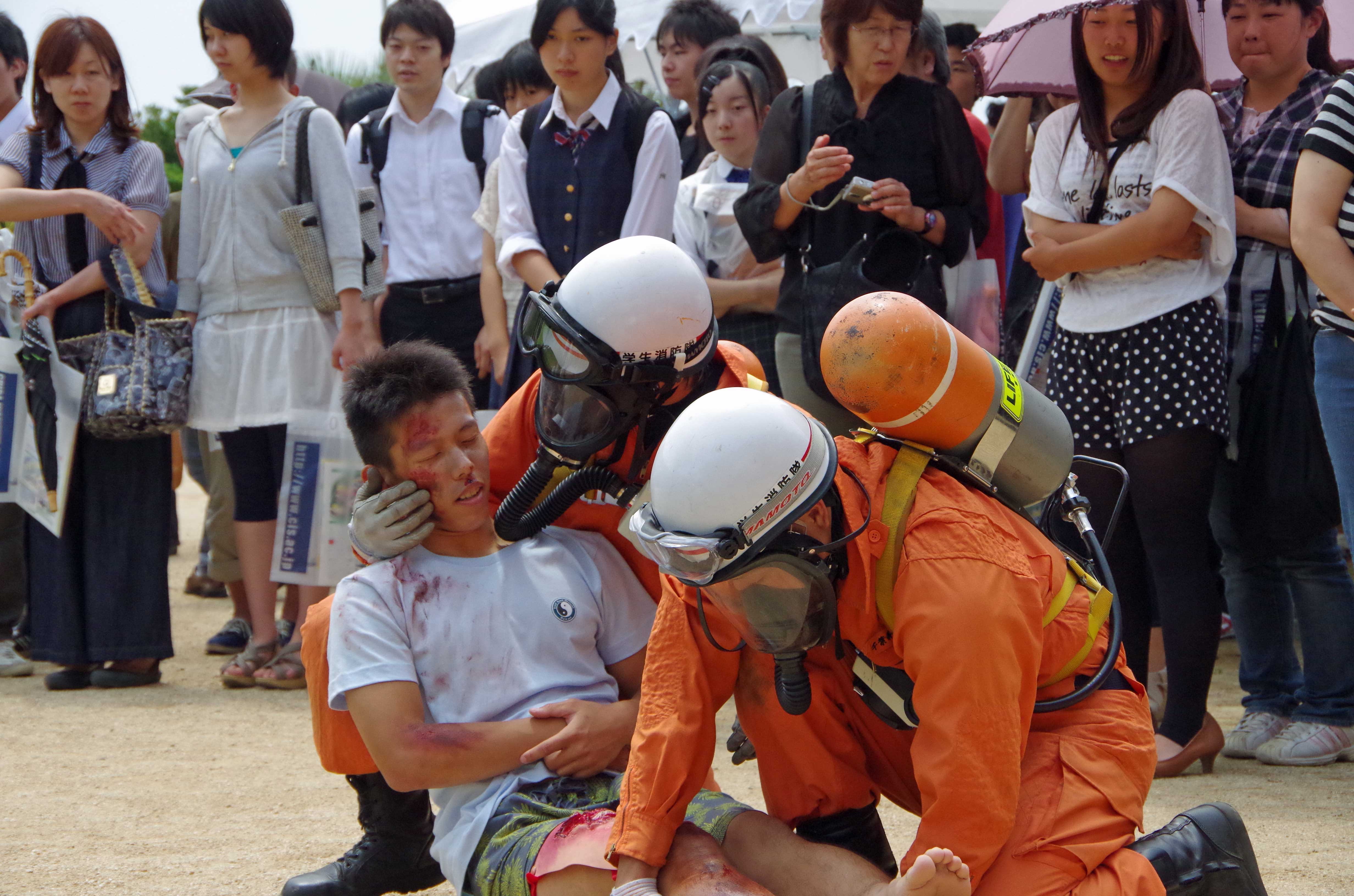 本日は気温がMAX30度を超える中、オープンキャンパス1日目で災害救助演習と放水体験を行いました! まず、災害救助演習ではポンプ隊役とレスキュー隊役、学生消防隊役、傷病者役に分かれて学生警察支援サークルスターラビッツ(以下SRと称する。)と協力して演習を実施しました。 ↑ポンプ隊の活動状況 ↑レスキュー隊の救出状況 ↑学生消防隊役の救護状況 ↑SR隊員による車両検査状況 ↑レスキューチーム ここで種明かしをしますが、この度我々のパートで演習に参加しているのは、ほぼ1年生です。入って7か月でまだ経験が浅いですが、隊のクオリティを上げていくために今の時期から本格的に訓練実施します。弱音をあげる隊員や悔しい顔をする隊員もいましたが、それを糧にこれからの活動に取り組んでほしいですね。 学生消防隊という名を背負っているのは1年生も同じですから。 さて、その後は放水体験を行いました。 ↑体験状況 安全に行ってもらうために、しっかりと指導はもちろんのこと安全管理を配置し実施しました。 体験者は「意外と重たいんですね。」や「勢いがすごっす!」など、圧倒されていた様子でした。 これらを機にぜひ入隊してほしいですね! そんな傍らでしっかり展示場を設け、通りかかった来場者に見ていただけるよう努めました。 ↑展示場の風景 消防隊のパンフレットが予想以上に減っていてうれしかったです。(笑) 明日も災害救助演習と放水体験を行いますので、ご覧になりたい方は千葉科学大学マリーナキャンパスまでお越しください! 災害救助演習は池のある中庭で11時45分より開始します! 放水体験は車庫前(図書館の裏側)で午後1時より開始します! お待ちしています! ~今日のオフショット~ 殴り合いのケンカ!? すごい怪我!! ではないんです。ご安心ください(笑) このブログの写真をよく見てる方は気づくはず。。 レスキューの写真をもう一度見てみてください、わかりますよ 実はこの二人は傷病者役なんです。メイクがリアルすぎますよね(笑)